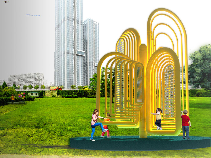 한강공원에는 봄, 여름, 가을 아이들이 만끽할 수 있는 넓은 공간이 존재하지만, 정작 아이들이 놀이를 경험할 수 있는 장치나 인프라가 곳곳에 조성되어 있지 않아 아이들의 흥미를 끌어내기 쉽지 않은 공간이다. 본 작품은 아이들이 일상생활에서도 자신들의 시각으로 자율적으로 놀이 기구로 이용하는 “문”의 작동기제를 현실적이지 않은 스케일로 변형하고, 바람에 의해 파편적으로 회전하는 거울 플립닷을 설치하여, 다양하고 변화무쌍한 공간과 풍경을 제공하는 조형물이다.