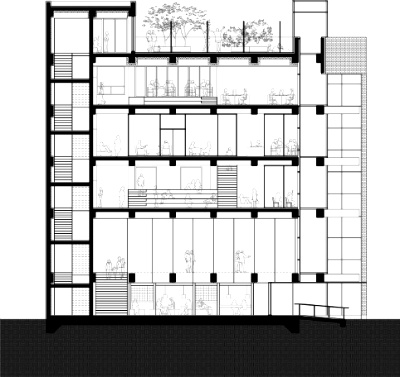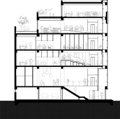 층과 층 사이의, 유사한 용도 사이의 대화는 기존 건물의 적층된 바닥을 일부 해체하여 유사한 성격을 지닌 1-2층, 3-4층, 5-6층 사이의 공간적, 시각적 연결을 유도함으로서 이끌어냅니다.