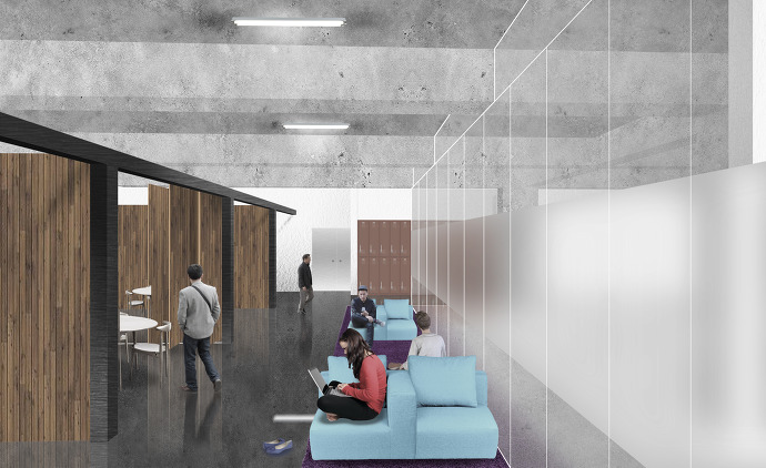 [4층 노동창업공간 및 노동자건강증진센터: 두가지 서로 다른 기능을 협소한 공간에 들여오면서 각각 공간의 성격을 규정해주는 것이 중요하다고 판단하였다. 그리하여 두 가지 서로 다른 기능이 만나는 접점에는 카펫이 깔린 좀더 소프트한 거실공간이 생겨 다른 목적으로 찾아온 노동자들이 편한 마음으로 쉬어갈 수 있는 장소를 제안하였다.]