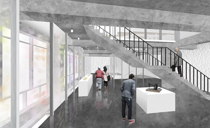 [2층 전시장: 2층과 3층의 연결계단을 통해 단면적 개방성을 꾀하고자 하였고, 1층과 2층 사이의 파사드를 면한 하부 개방을 통해 1-2층간의 단면적 연결을 시도하였다. 전시물품은 정해져 있지 않은 상황에서 전시방식의 기획이 면밀하게 논의되기를 기대하였으나, 이는 이루어지지 않았고 현재 다른 주체에 의해 진행 중이다]