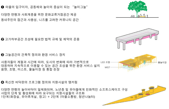 과업의 성격에 따라 프로그램, 운영방안, 건축적 장치의 범위에 대한 생각뿐만 아니라, 공공공간의 조성에 있어 관계하는 여러 주체간의 관계에 대해 생각하지 않을 수 없는 프로젝트였다.