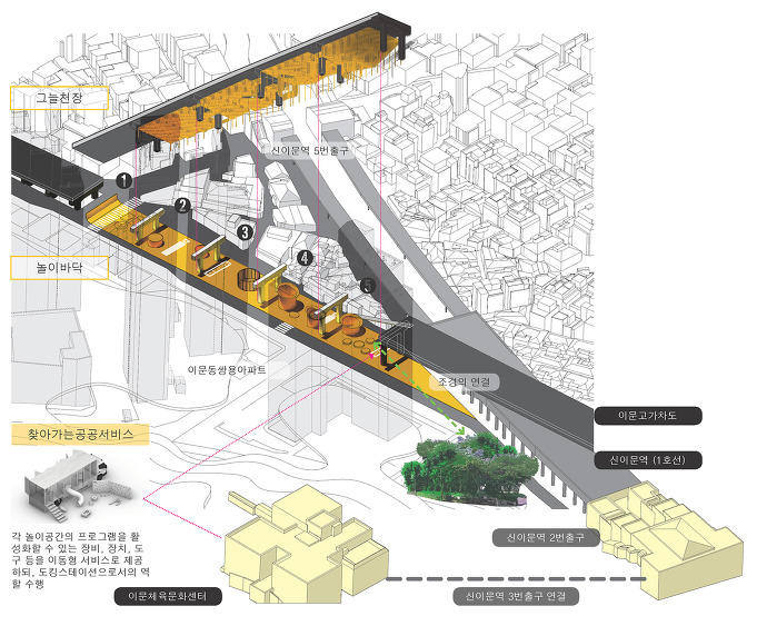 이동놀이터는 최근 트렌트에 따른 각종 놀이 장치 및 기구들을 제공하여 특화된 놀이공원을 제공토록 하며, 이는 이문고가 하부공간에만 서비스를 국한하는 것이 아니라, 지역구의 도시 공공공간에 이동하여 팝업프로그램을 운영할 수 있도록 한다. 아울러, 노인들의 체육 및 건강 프로그램 역시 고정된 체육기구 방식이 아니라, 각종 장비들을 필요에 따라 설치하여 그에 따른 교육이나 관리도 함께 이루어질 수 있도록 제안하고 있다.