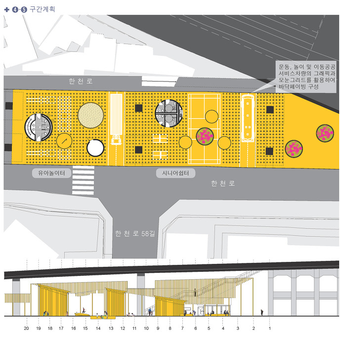 최대한 심플하지만, 위트가 있는 바닥 공간을 구성하는 것을 목표로 하였다. 화사하면서 생동감넘치고, 시각적으로는 안전성을 확보할 수 있도록 노란 색상을 선정하였고, 바닥재질은 노인 및 유아 친화적인 소프르한 재료를 염두에 두었다. 각종 이동서비스나 체육시설들이 놓일 위치는 해학적인 그래픽으로 표현되는 것을 제안하였다.