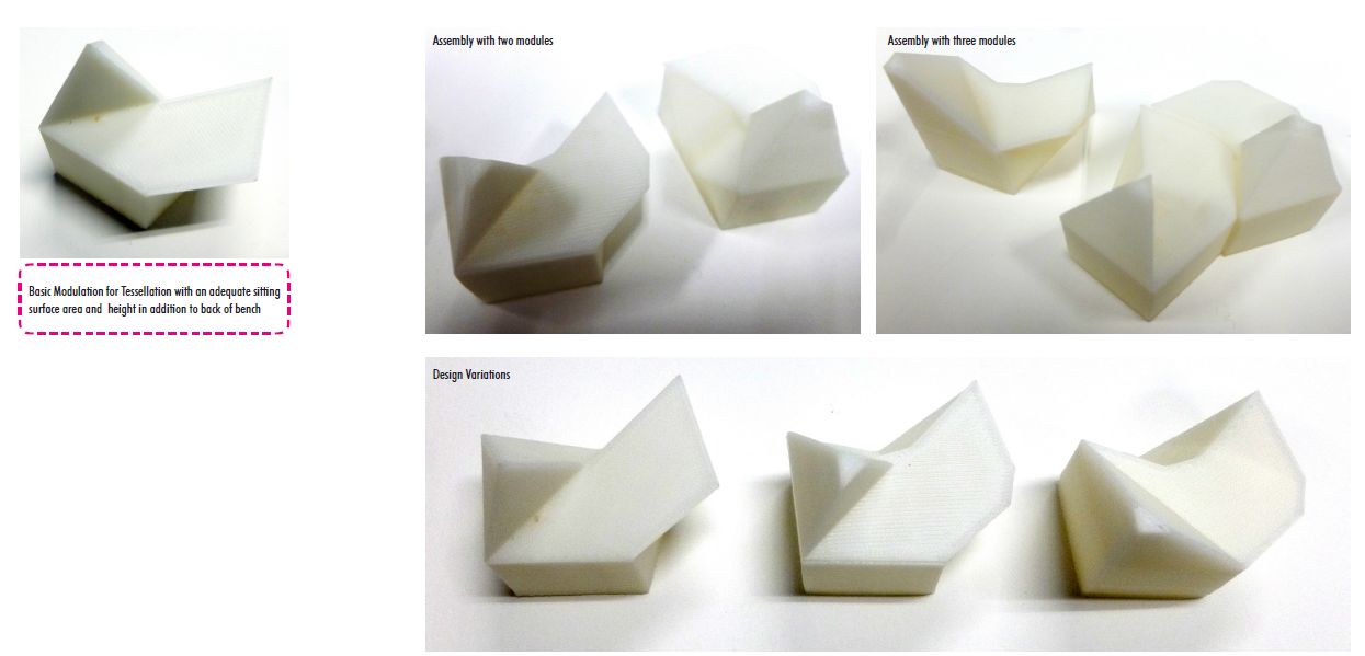 디지털 미디어 수업 과제로 만들어진 3d 프린팅 테셀레이션 결과물들을 받아 과연 이러한 형태들이 의자로서 기능할 수 있는가부터 살펴보았다. 학생들의 과제물은 3차원적으로 서로 무한한 조합이 가능하도록 볼록한 면과 오목한 면이 맞닿도록 만들어져 있었다. 그러한 형태는 의자의 앉는 면을 형성하지 못한다는 기본 문제가 있었다. 그래서 M.C.Escher의 그림들이나 테셀레이션 패턴들을 들여다보면서, 형태적 방향을 잡아나갔다. 예를 들어, 가장 기본적으로는 대칭을 이루는 선들로 구성되는 것이 쉬운 방향이라면, 각도를 조금 틀더라도 그러한 미묘한 차이로 인해, 확장되는 패턴의 조합들이 좀 더 역동적이거나, 개인적인 기준에서의 아름다움을 보다 더 표현할 수 있었다. 6개의 모듈이 방사형으로 조합되고 그러한 조합들이 다시 방사형으로 조합되어 확장될 수 있고, 그 조합들이 변형되면 선형으로 확장될 수 있는 방식을 구성하였다. 이렇게 아주산업과의 UHPC 스트리트 퍼니처의 기본 모듈이 선정되었고, 3d 프린팅을 통해 디자인을 협의하고 제작에 대한 본격적인 논의 단계로 들어섰다.