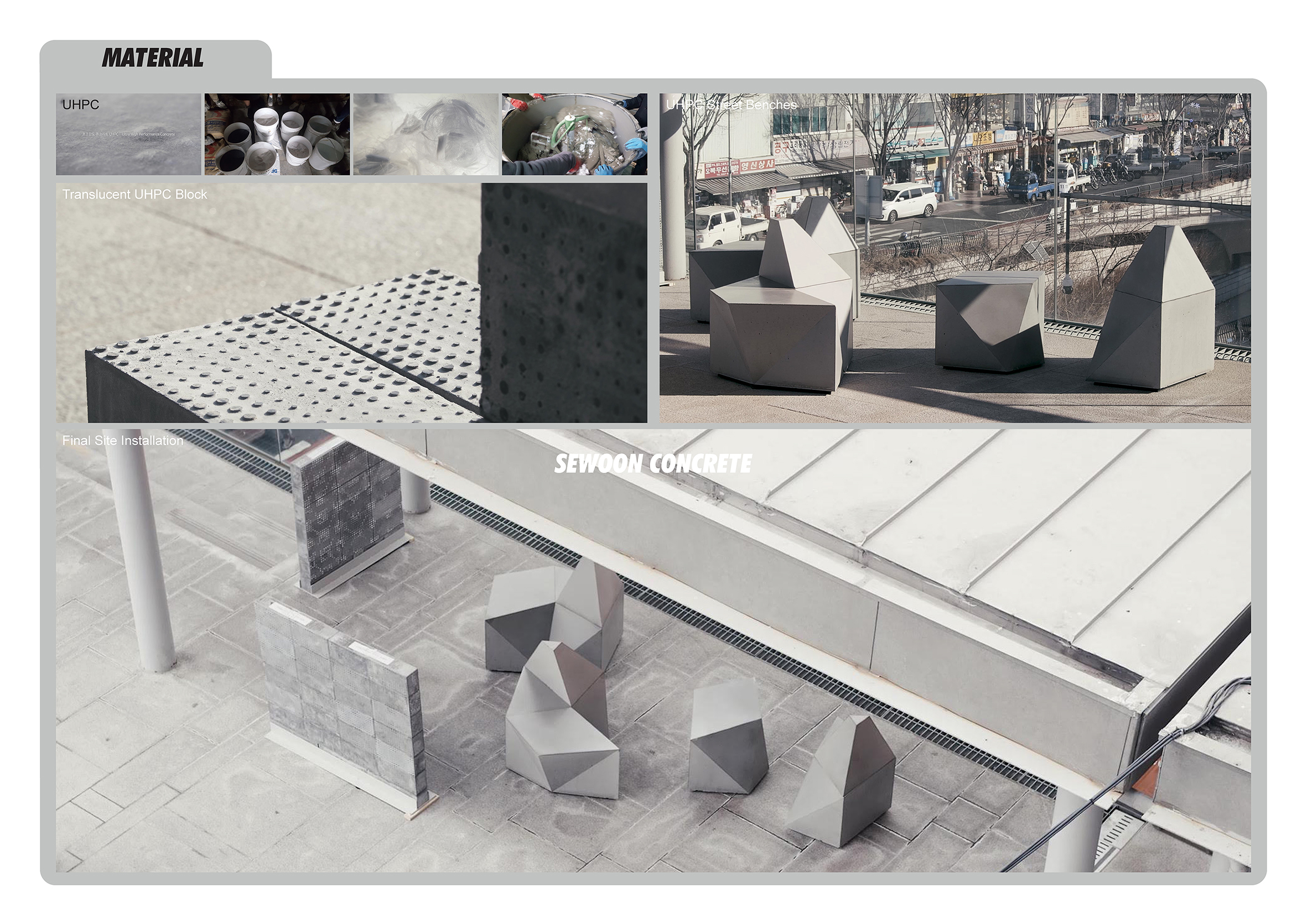 UHPC란 소재를 접하게 된 것은 ‘건축재료와응용’이라는 수업을 맡으면서, 콘크리트와 관련된 최신기술을 강의 내용에 포함시키면서부터이다. 해외 실무 경험을 통해서는 노출콘크리트, GFRC(유리섬유강화콘크리트), 광섬유를 사용한 빛이 투과하는 콘크리트 등은 프로젝트에 적용시켜 본 바는 있지만, 제조사의 샘플과 제품 정보를 확인하고 이를 프로젝트에 적용시켜 시공과정에는 전적으로 시공사에 의존하여 결과물을 확인하는 방식으로만 이러한 재료를 접해본 터이다. 그런데 콘크리트 수업을 준비하며 일반 콘크리트에 비해 강도 및 성능이 증대된 “HPC”와 “UHPC” 개념을 접하게 되었고, 프랑스에 적용된 사례들을 보면서 이러한 기술이 과연 한국에 들어올까 하는 의구심을 가졌던 것이 2014년이다. 그리고 당시 GFRC 패널을 외장재로 사용하는 것조차도 고가의 고급 건축자재로 인지되었다. 그런데 불과 3년 이내에 UHPC가 KIST의 파빌리온에 적용되더니, 하나은행 리모델링에 괴이한 3차원적 형태의 외피 패널로 적용되는 것을 목격하였다. 기술 이전 속도에 대한 희망적인 충격을 받은 시기이기도 하다. 이러한 정보들을 서울도시건축비엔날레의 토크를 통해 접할 수 있었고, 그 와중 UHPC를 연구하고 있는 기업과 공학자를 만나게 되었다.
