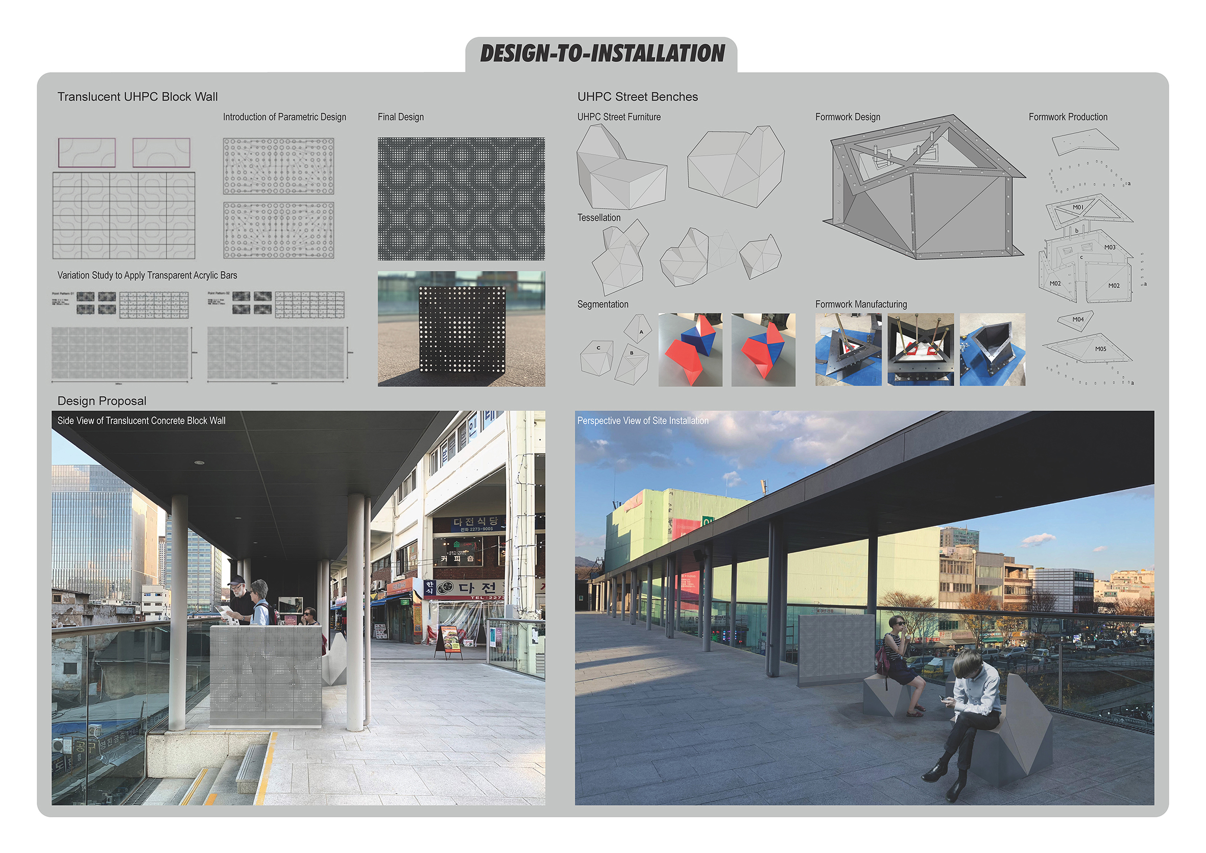 The final products of UHPC street benches and block walls were installed on the deck of Sewoon Building as a result of one-day building workshop on December 21, 2019 in commemoration of the 100th anniversary of the University of Seoul, with the support and approval by Seoul Metropolitan Government. The installation site is the public passage which great many Seoulites pass by every day. The benches and walls as the tangible creations would stimulate public curiosity and motivate learning of novel materials and design intentions behind extensive processes, finally to expand the inspiration for technology and the sustainable society and manufacturing culture.