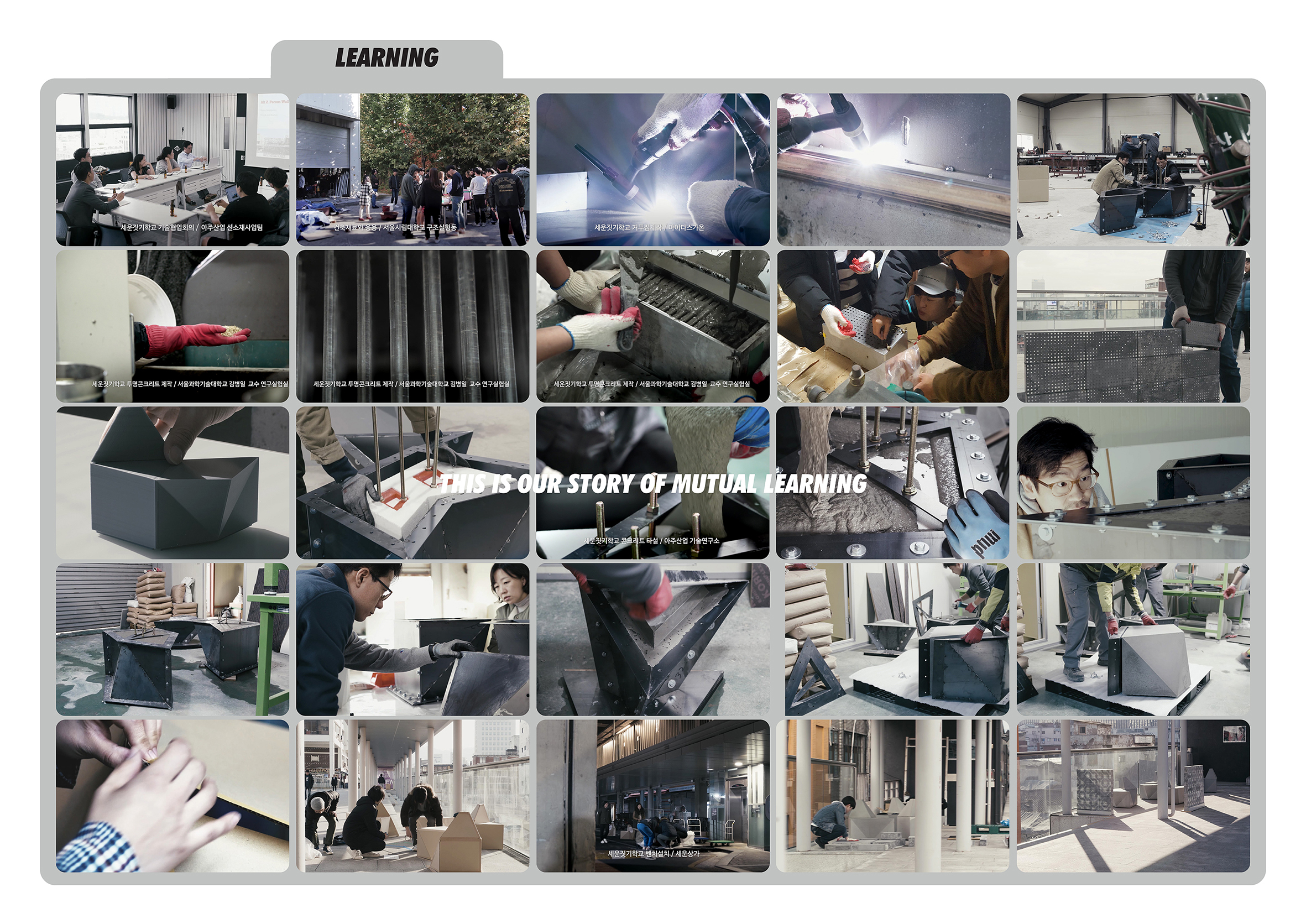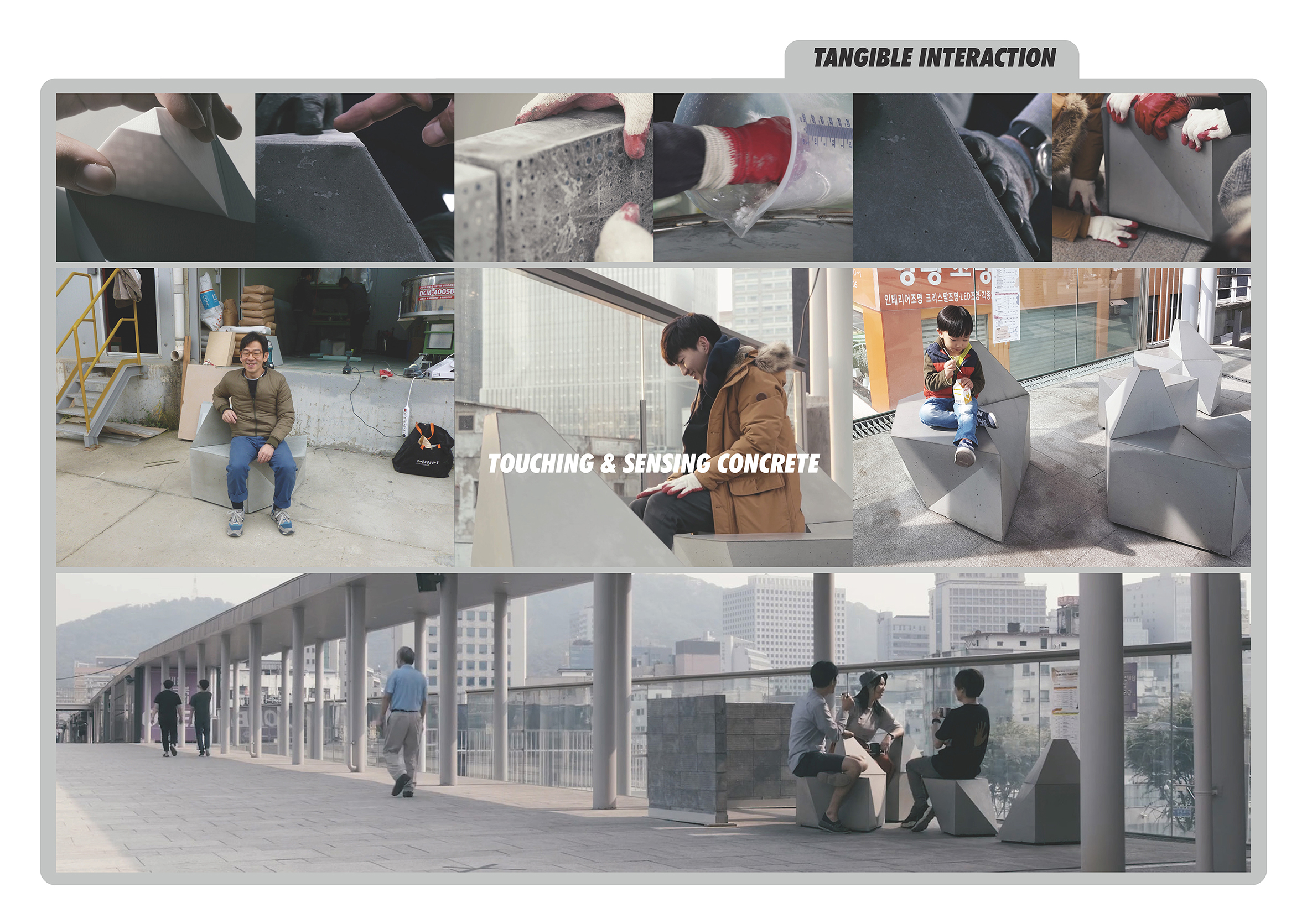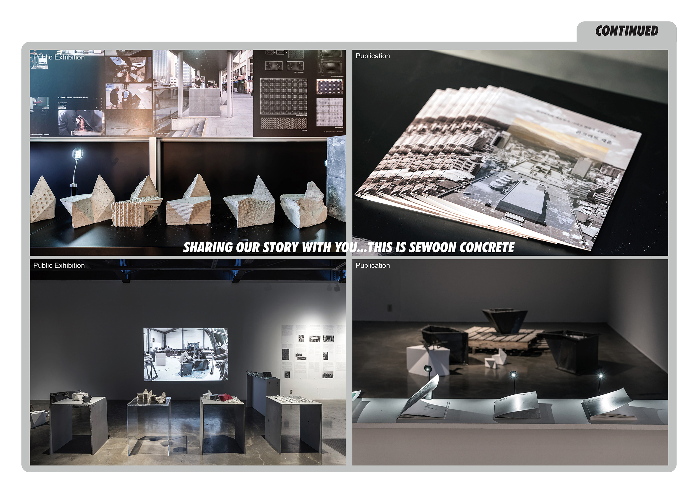 Within the realm of architectural education in the university, we target for students to acquire knowledge of not only design but also society and technology. Also, we desire to carry out the social mission to educate the general public on senses of design and places. To successfully accomplish such educational ambitions, we, educators as designers, need to teach ourselves on emergent technology and social issues. re:SEWOON ultra:CONCRETE was initiated with the aforementioned education objectives.