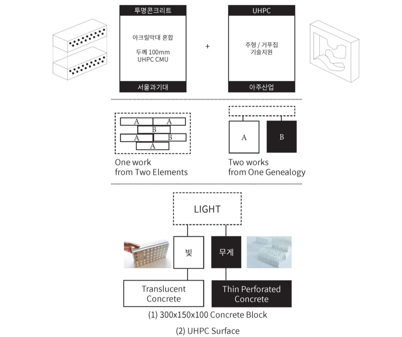 건축가의 다양한 요소들을 하나의 우산 아래 두어 일관적인 개념으로 모든 것을 설명하고자 하는 개인적 욕구와 신념에서, 어떻게든 그 두 가지를 하나의 개념으로 관통시키고 싶었다. 한 개의 개념이 적용되는 방식은 크게 두 가지로 달라질 수 있다고 생각하였다. 한 개의 큰 설치물이 있고, 그것을 구성하는 개별적인 요소로 두 협력 작품이 포함되는 방식과, 두 가지의 작품이 독립적으로 진행되지만 가장 근본적인 아이디어나 개념을 공유하여 계통을 같이 하는 방식이 있을 것이라 생각하였다. 예를 들면, “Light”라는 개념을 기본 개념으로 하였을 때, “빛”, 그리고 “가벼움”이라는 주제로 세분화되어, “빛”이라는 주제는 빛 투과 콘크리트로, “가벼움”의 주제는 UHPC 패널로 발전시킬 수 있을 것이다. 혹은 하나의 형태를 초기 모티브로 공유하지만 각기 블록, 판의 형태로 발전되면서 달라지는 차이점을 확인할 수 있는 폴리 구조물을 두 점을 디자인, 설치할 수도 있을 것이다.