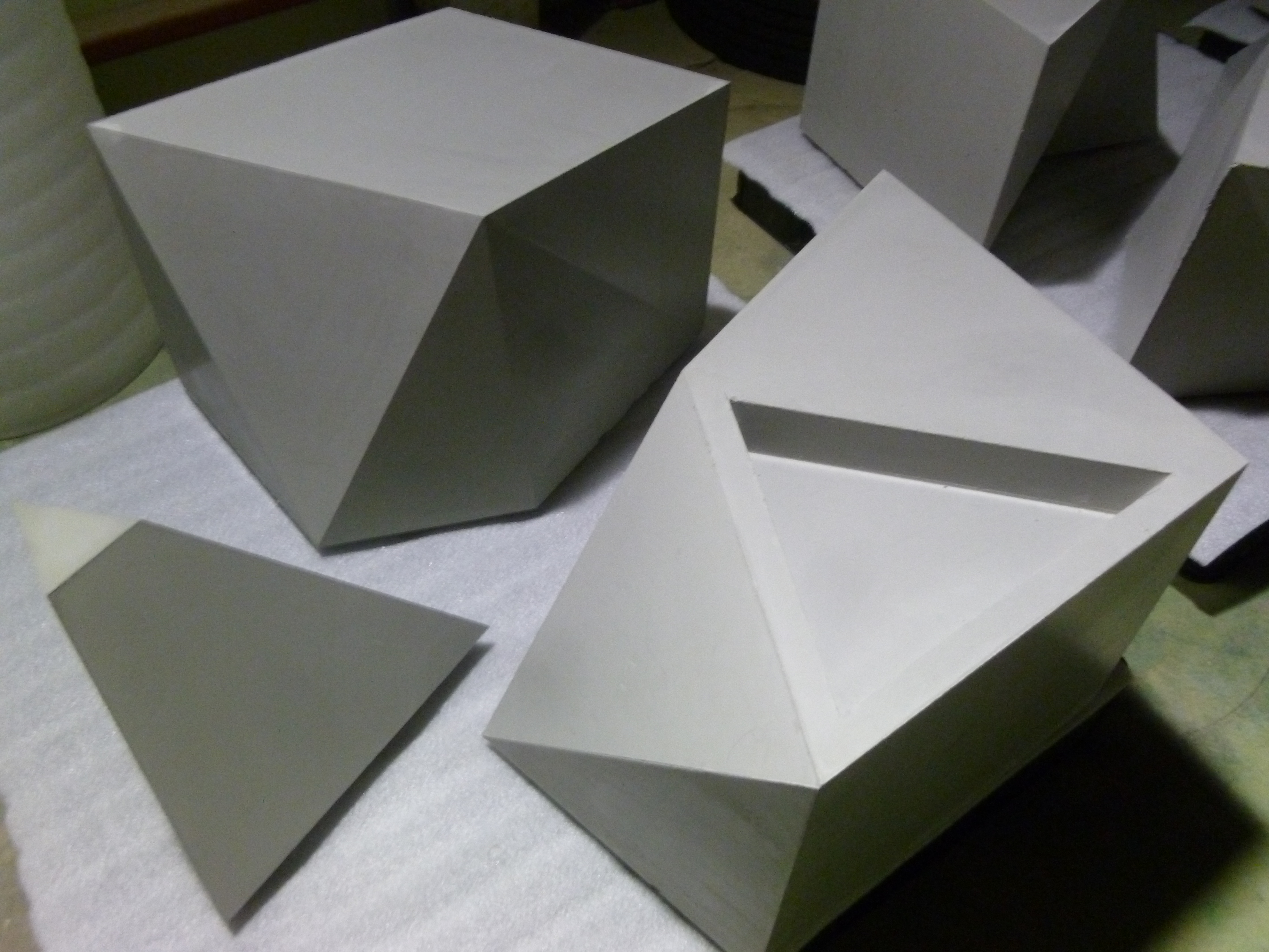 빛 투과 콘크리트 블록의 디자인은 4학년, 5학년 학생들로 구성된 소그룹이 주도하였는데, 이들은 이미 지난 수년간 건축재료와응용, 디지털미디어 등의 수업을 통해 본 디자인 활동에 필요한 기본적인 지식, 기술을 습득한 상태였다. 그리고 3차원 테셀레이션은 2학년 학생들이 디지털 미디어 수업을 통해 그 디자인과 제작을 한 경험이 있는 상태로, 건축재료와응용에서는 테셀레이션 형태를 제공하고 그것의 역상인 거푸집과 거푸집을 구성하는 표면에 주목할 수 있도록 과제를 제시하였다. “거푸집대작전”이라는 행사로 진행되었는데, 학생들은 주어진 3차원 모형을 숙지하고 거푸집 제작에 필요한 도안을 사전 준비하고, 타설될 콘크리트 결과물의 표면적 특징을 부여할 수 있는 재료 역시 준비하도록 안내되었다. 그리고 수업 중 거푸집 제작을 진행하고, 차주 수업시간에는 구조 실험동에서 몰탈을 혼합하여 타설하는 과정을 직접 체험하였다.
