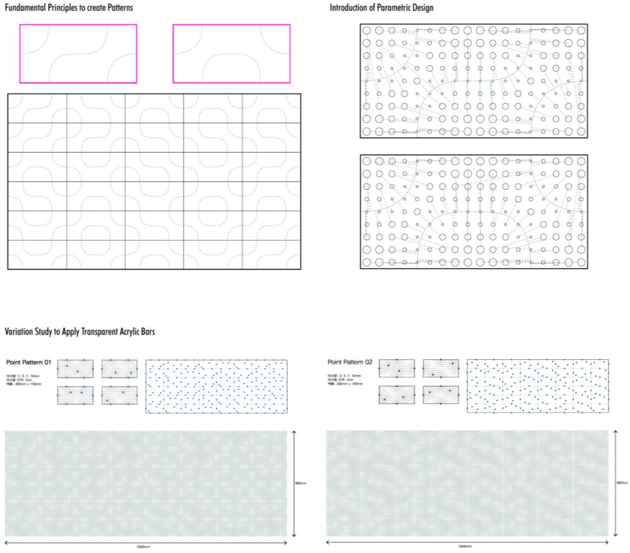 한편, 한 작업이 “테셀레이션”이라는 개념으로 접근되고 있다면, 나머지 작업 역시 다른 방식을 통해서라도 “테셀레이션”의 개념을 공유할 수 있는 디자인 접근이 필요하다고 생각하였다. 그래서 처음에는 단순히 스트리트 퍼니처 디자인의 도안을 2차원으로 변형하고 그러한 테셀레이션 패턴을 2차원으로 구현하는 방식으로 접근하였다. 3d 프린팅으로 기본 모듈 블록을 제작해본 결과 그 패턴이 초기 의도대로 읽히지 않음을 확인하고 다른 방식으로 접근할 필요를 느끼게 되었다. 그리고 이 단계에서 학생들로 이루어진 디자인 팀이 결성되었다. 디자인 팀과의 협의를 진행하면서, 타일 디자인 개념 예시를 통해 두 가지 혹은 세 가지 모듈 타일을 디자인하여 그것들이 보이는 방식에 따라 연속적인 패턴들을 형성할 수 있는 2차원 테셀레이션 아이디어를 발전시켰다. 그리고 이 단계에서의 디자인 스터디는 학생들이 참여하는 방식으로 진행되었으며, 그래스호퍼를 사용하여 패턴의 방식, 삽입되는 아크릴 봉의 크기, 종류 등을 다양하게 대입하면서 여러 가능한 디자인 안들을 생산해냈다.
