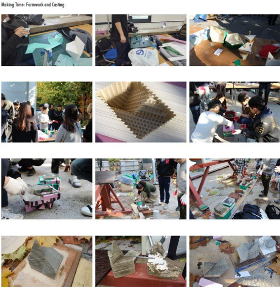빛 투과 콘크리트 블록의 디자인은 4학년, 5학년 학생들로 구성된 소그룹이 주도하였는데, 이들은 이미 지난 수년간 건축재료와응용, 디지털미디어 등의 수업을 통해 본 디자인 활동에 필요한 기본적인 지식, 기술을 습득한 상태였다. 그리고 3차원 테셀레이션은 2학년 학생들이 디지털 미디어 수업을 통해 그 디자인과 제작을 한 경험이 있는 상태로, 건축재료와응용에서는 테셀레이션 형태를 제공하고 그것의 역상인 거푸집과 거푸집을 구성하는 표면에 주목할 수 있도록 과제를 제시하였다. “거푸집대작전”이라는 행사로 진행되었는데, 학생들은 주어진 3차원 모형을 숙지하고 거푸집 제작에 필요한 도안을 사전 준비하고, 타설될 콘크리트 결과물의 표면적 특징을 부여할 수 있는 재료 역시 준비하도록 안내되었다. 그리고 수업 중 거푸집 제작을 진행하고, 차주 수업시간에는 구조 실험동에서 몰탈을 혼합하여 타설하는 과정을 직접 체험하였다.
