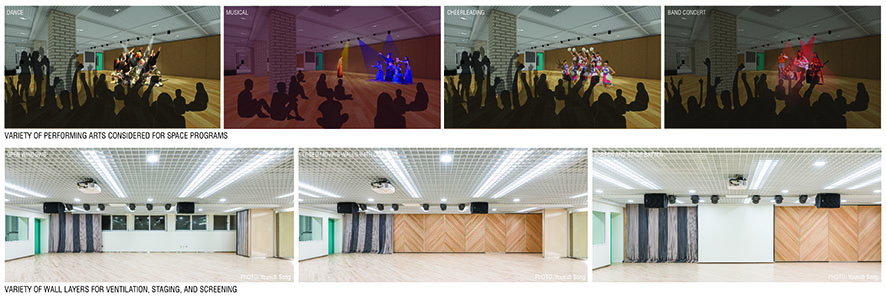 기능에 대해서는, 학생들의 경우에는 별도의 공연장보다는 공연관련 동아리 연습실에 대한 필요가 크게 나타난 반면, 학교측에서는 고정형 좌석 등이 확보된, 공연장 본래의 모습의 갖추길 원하였다. 따라서 설계안은 두 가지 기능을 모두 담을 수 있는 유연함을 담아야했다.