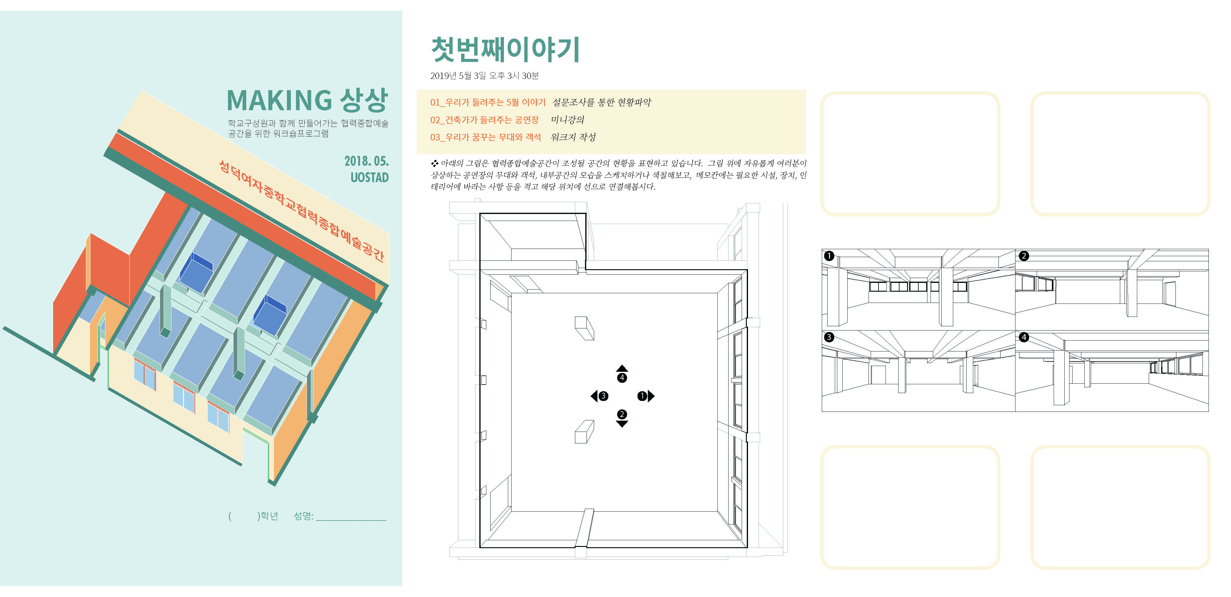 서울시교육청 공간혁신사업의 일환으로, 성덕여자중학교에 협동종합예술공간을 조성하는 과정을, 학교 교장선생님, 교감선생님, 행정실장님 그리고 관련 동아리 및 학생회 학생들과의 워크숍을 통해 진행하였다.
