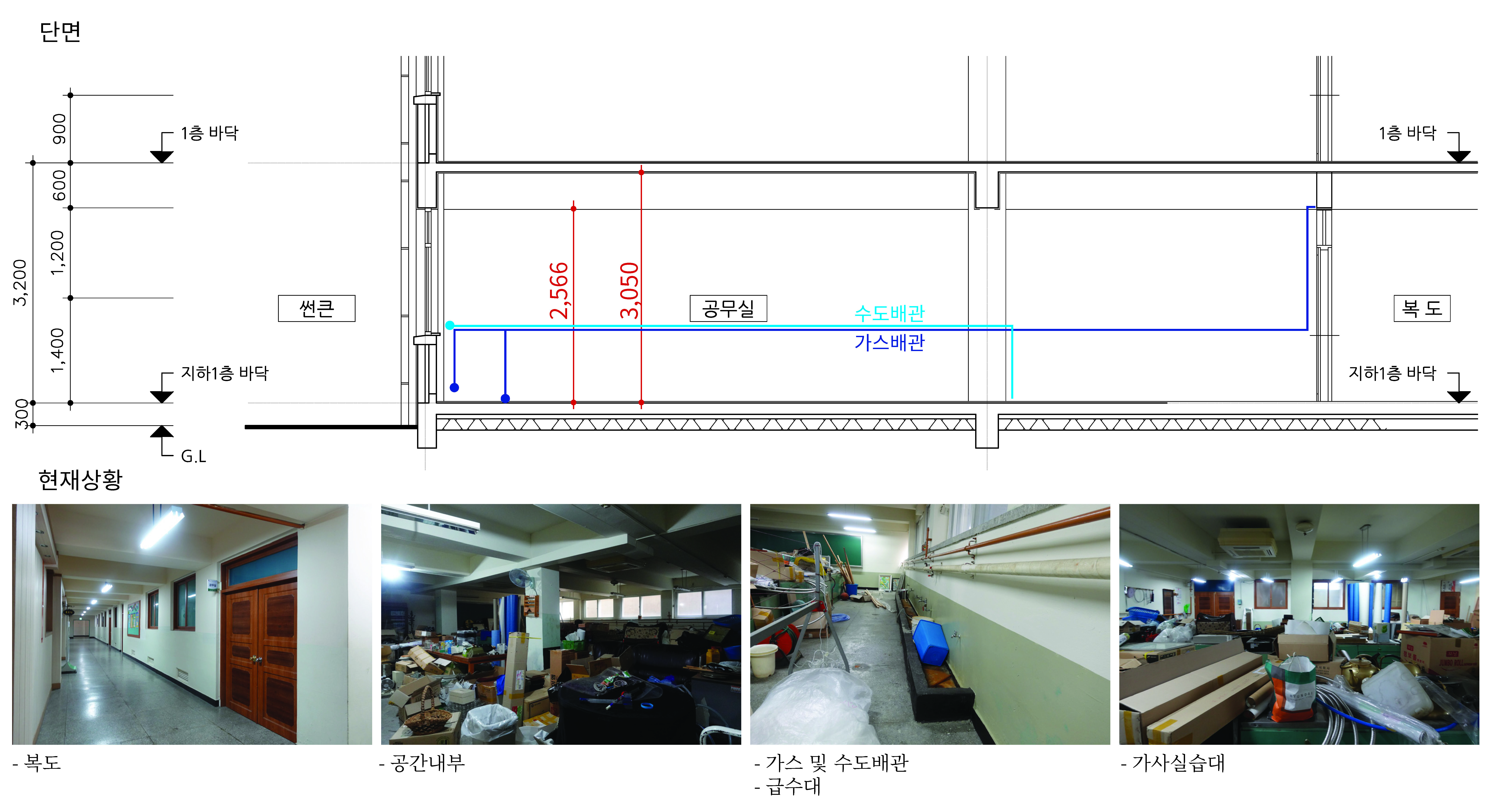 이러한 두가지 조건이 본 설계의 방향을 설정하는데에 가장 큰 고려사항이었으며, 지하층에 위치한 것을 최대한 극복하면서, 동시에 새로운 공간의 조성을 통해 지하공간에 활기를 불어넣을 수 있는 방안을 고심하면서 접근하였다.