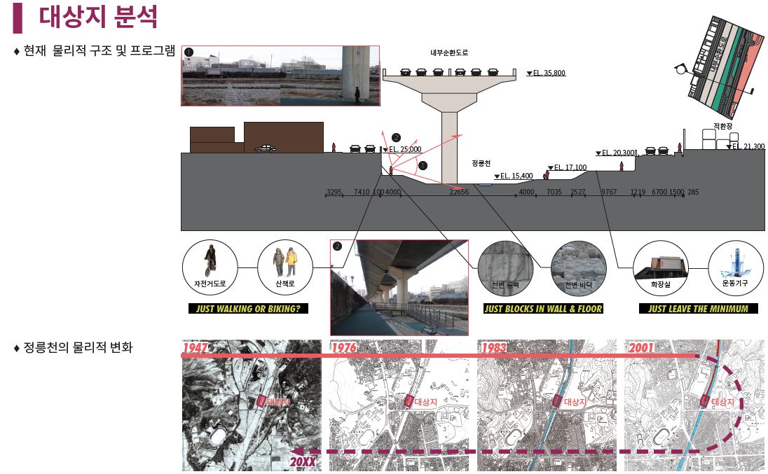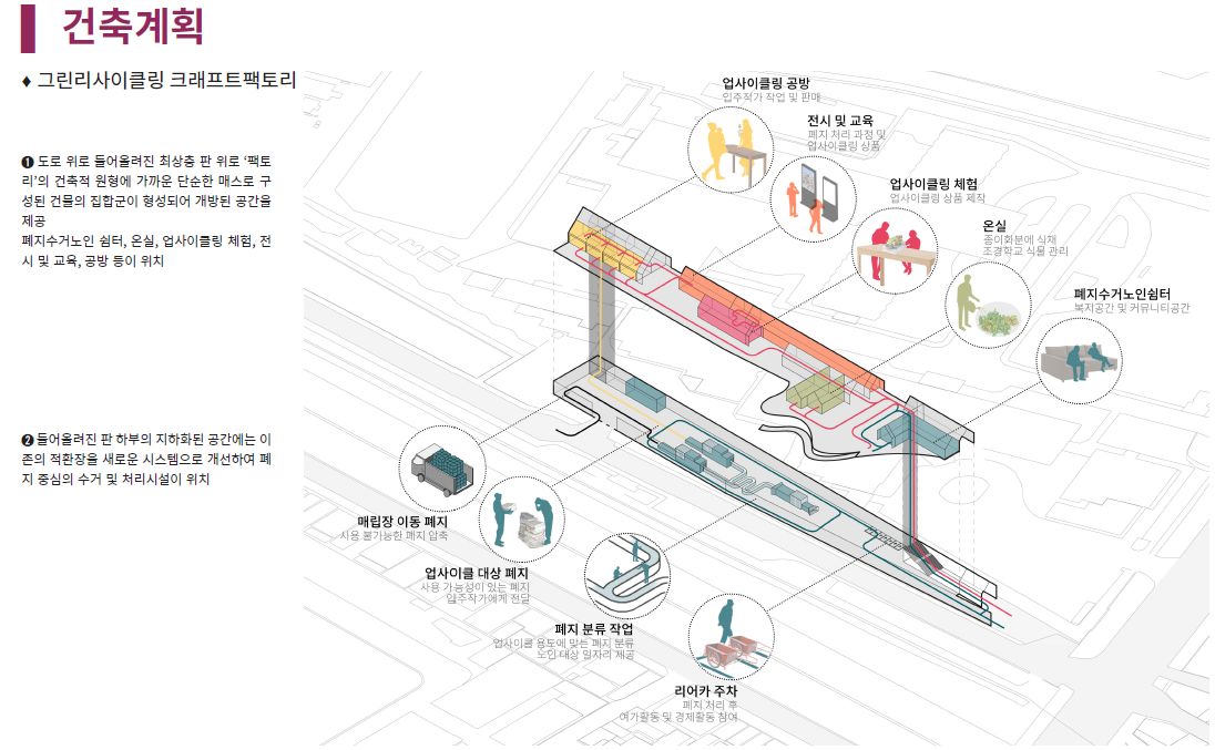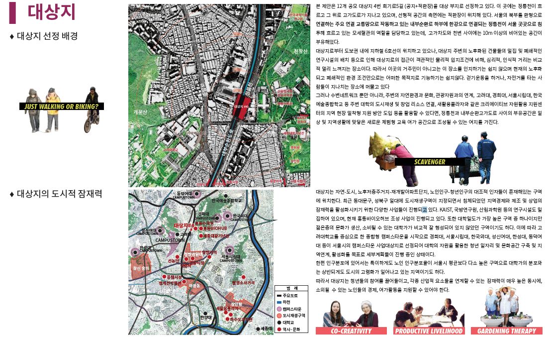 본 제안은 서울특별시 내 저이용 도시공간에 대한 대상지 활성화 아이디어 공모에 제출하였던 것으로 학부생 2명과 브레인스토밍 중심으로 진행한 결과로, 입상권에 들지 못한 제안이다. 제안을 건축적으로 발전시키지 못하고, 프로그램 중심의 활성화 방안을 제시한 것에서 그친 결과라고 생각한다.