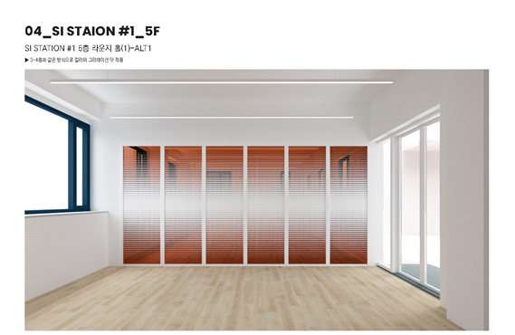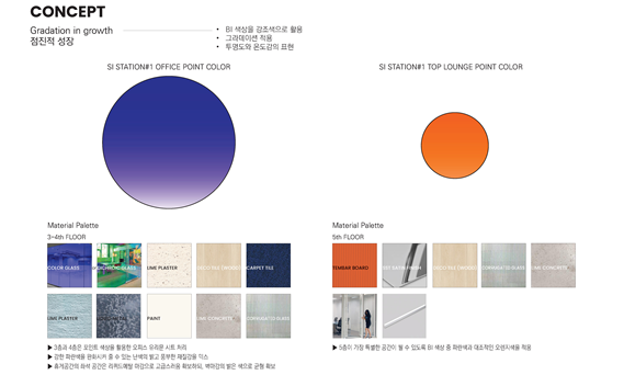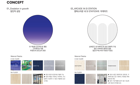 초기 단계에 두 가지의 공간디자인 개념을 제시하였는데, 첫 번째 개념은 점진적 성장을 색상과 그라데이션 효과를 통해 시각적으로 표현하는 것으로 BI 색상을 강조색으로 활용하며, 투명도와 온도감을 표현하는 제안이었다. 두 번째 개념은 여러 가지 시설, 프로그램 등으로 이루어지는 캠퍼스타운 내 SI STATION 안에 창업 기업들 간의 또다른 도시를 구축하고, 교류를 지원한다는 개념에서 아케이드 개념을 도입하였으며, 실내 공간 내 아케이드와 같은 형태를 구성하고, 밝은 무채색의 풍부한 질료를 적용하여 형태를 강조하고, 대신 다양한 질감과 텍스처를 절묘하게 적용하여 트렌디한 공간을 확보하는 제안이었다.