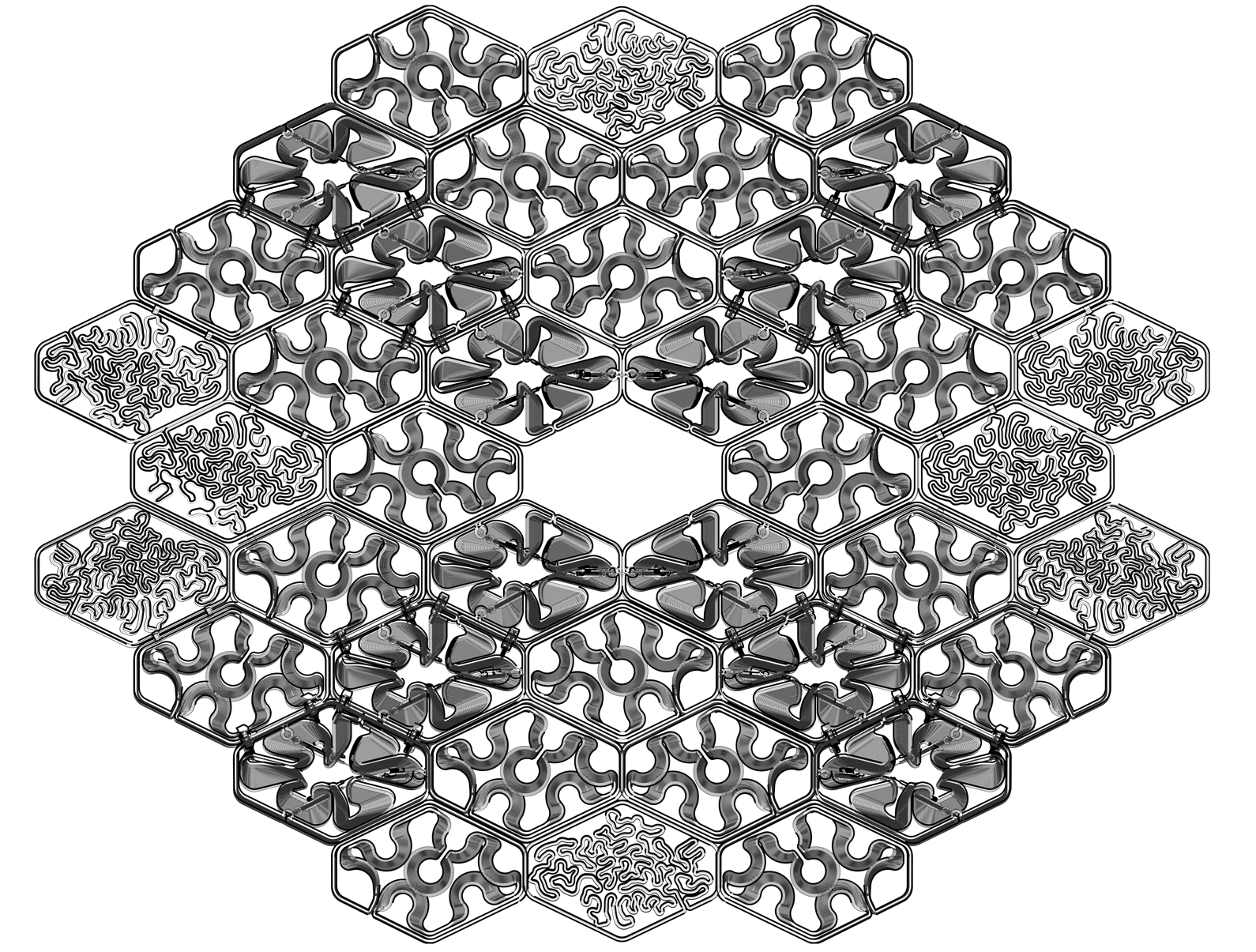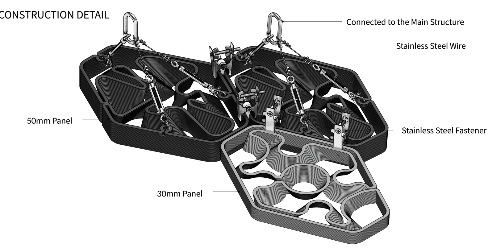 FGF로 생산되는 패널은 여러 디자인 스터디를 거쳐, 10mm, 30mm, 50mm의 두께를 가진 3가지 유형으로 결정되었으며, 각 유형에 따라 내부 패턴에도 차이를 두었다. 그림5와 같이, 50mm 패널은 와이어가 직접 연결되어 상부의 구조나 틀에 매달리고, 다른 패널들은 모두 연결접합 부재를 사용하여 50mm 패널에 연결되어 매달리도록 시스템을 구성하였다.