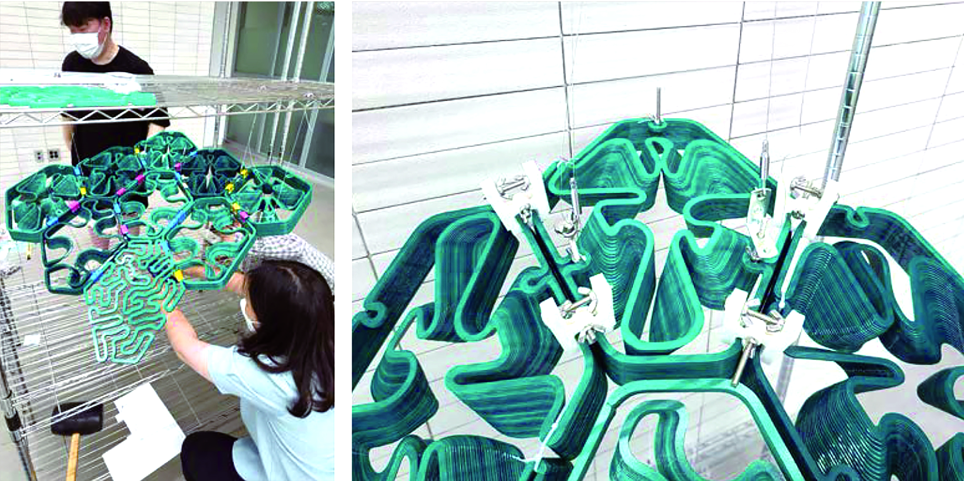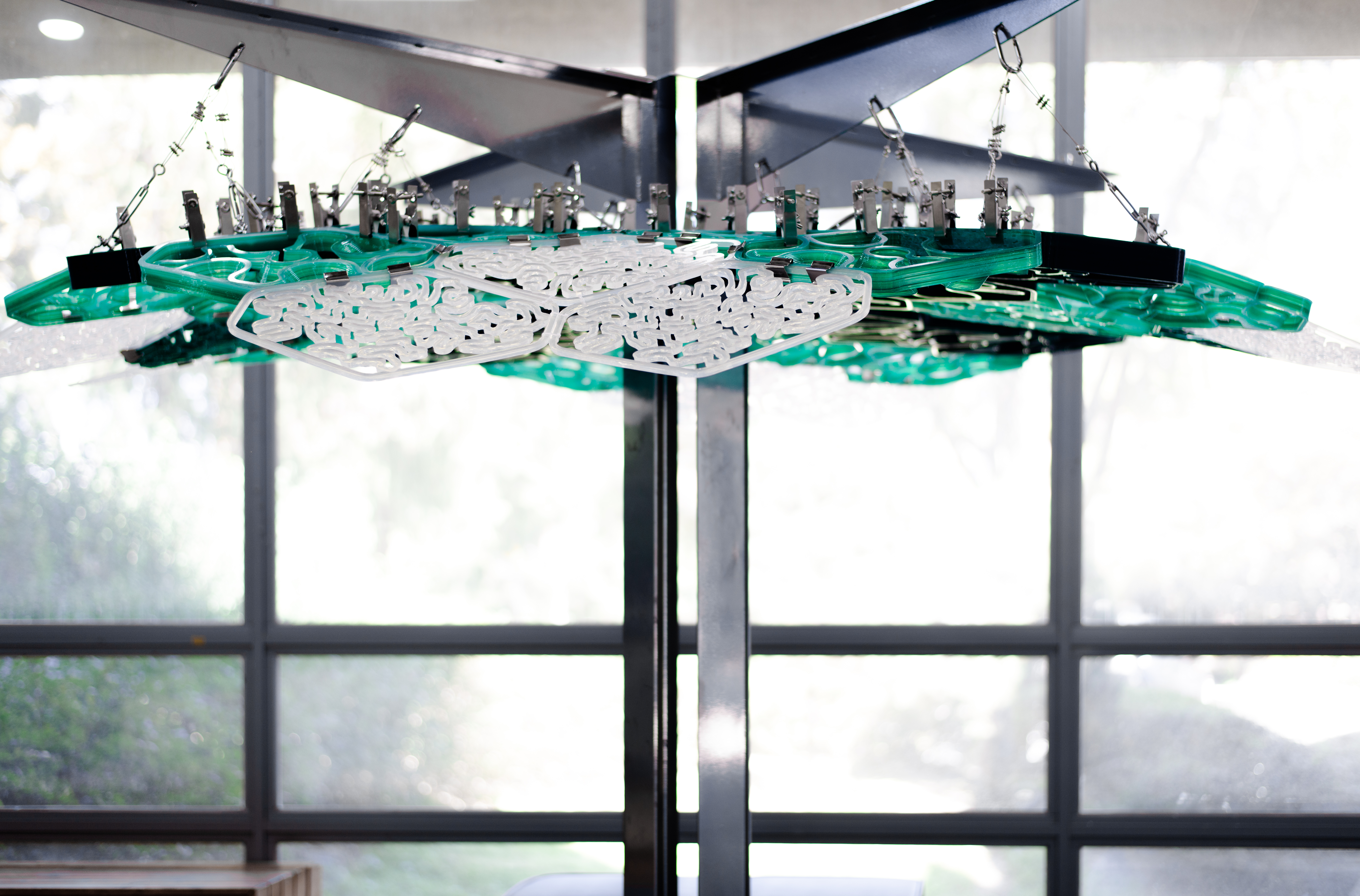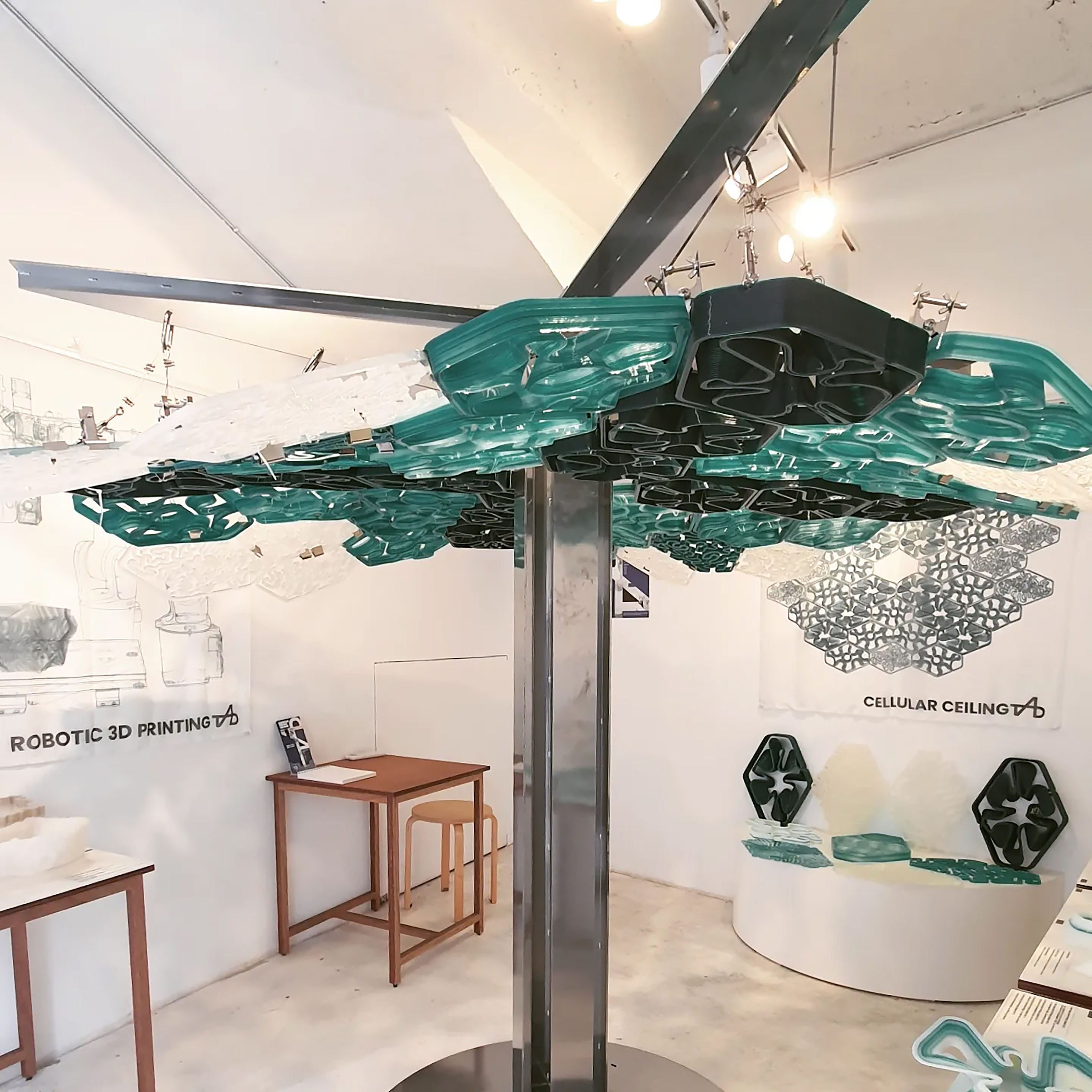 The main structure is designed like a tree trunk and branch. The three different ceiling types were made in different thicknesses and structural performances. Two thinner panels are attached to the thickest panels and those are hung with stainless steel wire from the steel structure. Panels are connected with the self-devised and manufactured clips, simpler clips and plastic wires. The major stainless-steel clip is made with laser-cut and bent plate, corrugated rubber plate, and FDM parts with other hardware. The groove in the rubber plate will be helping to fasten the additive layers. Also, the FDM parts controls the connection angle to create the 3D curved shape of the whole installation.