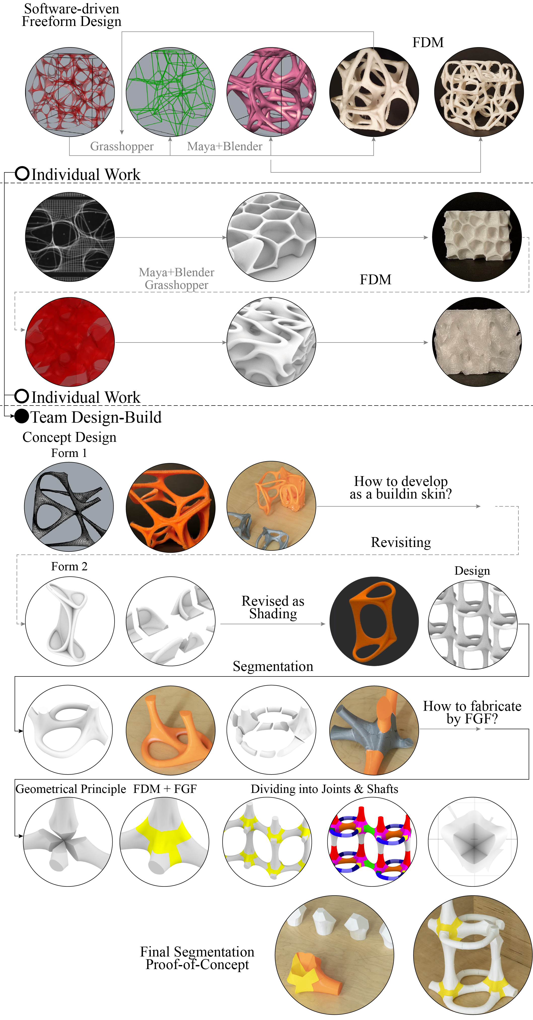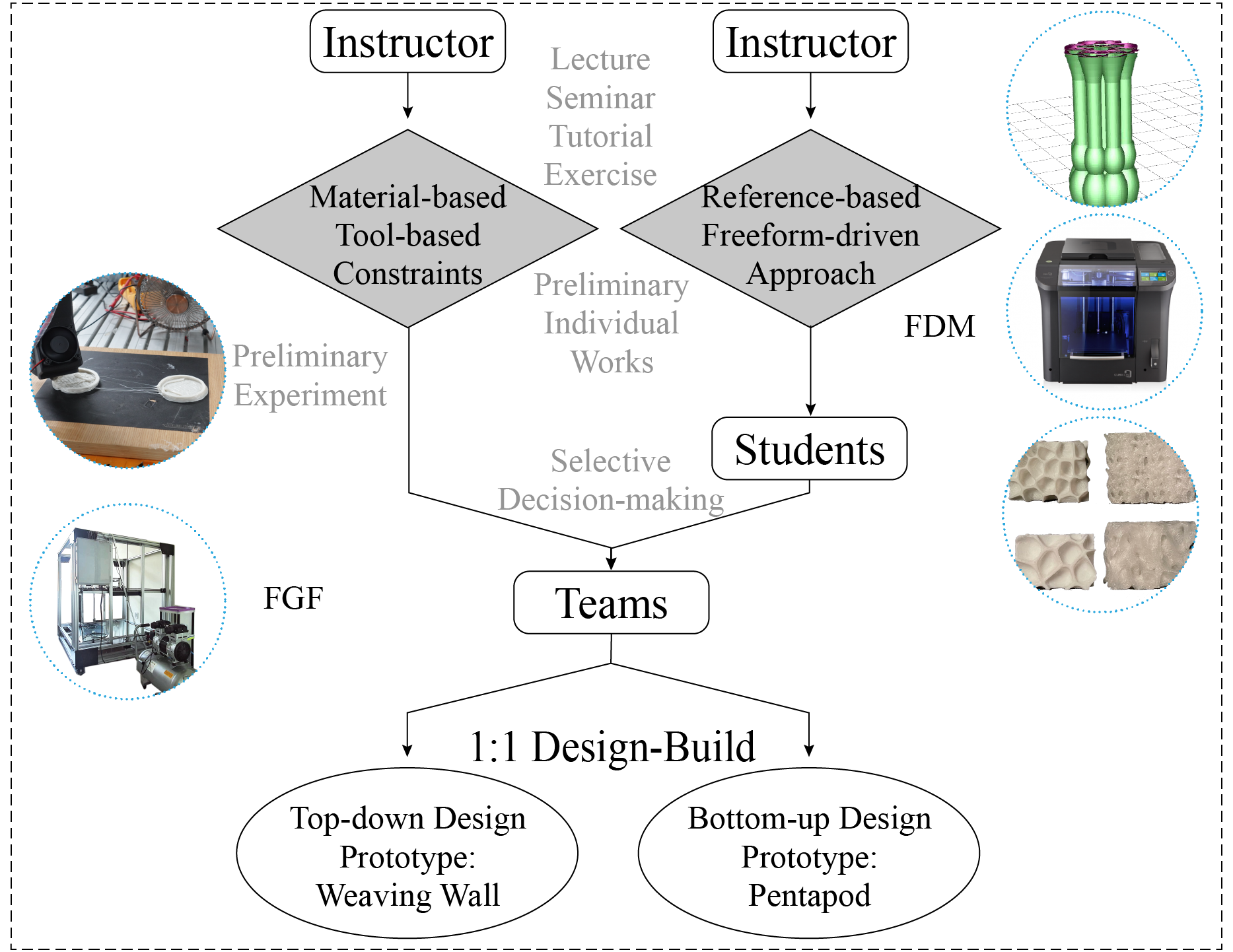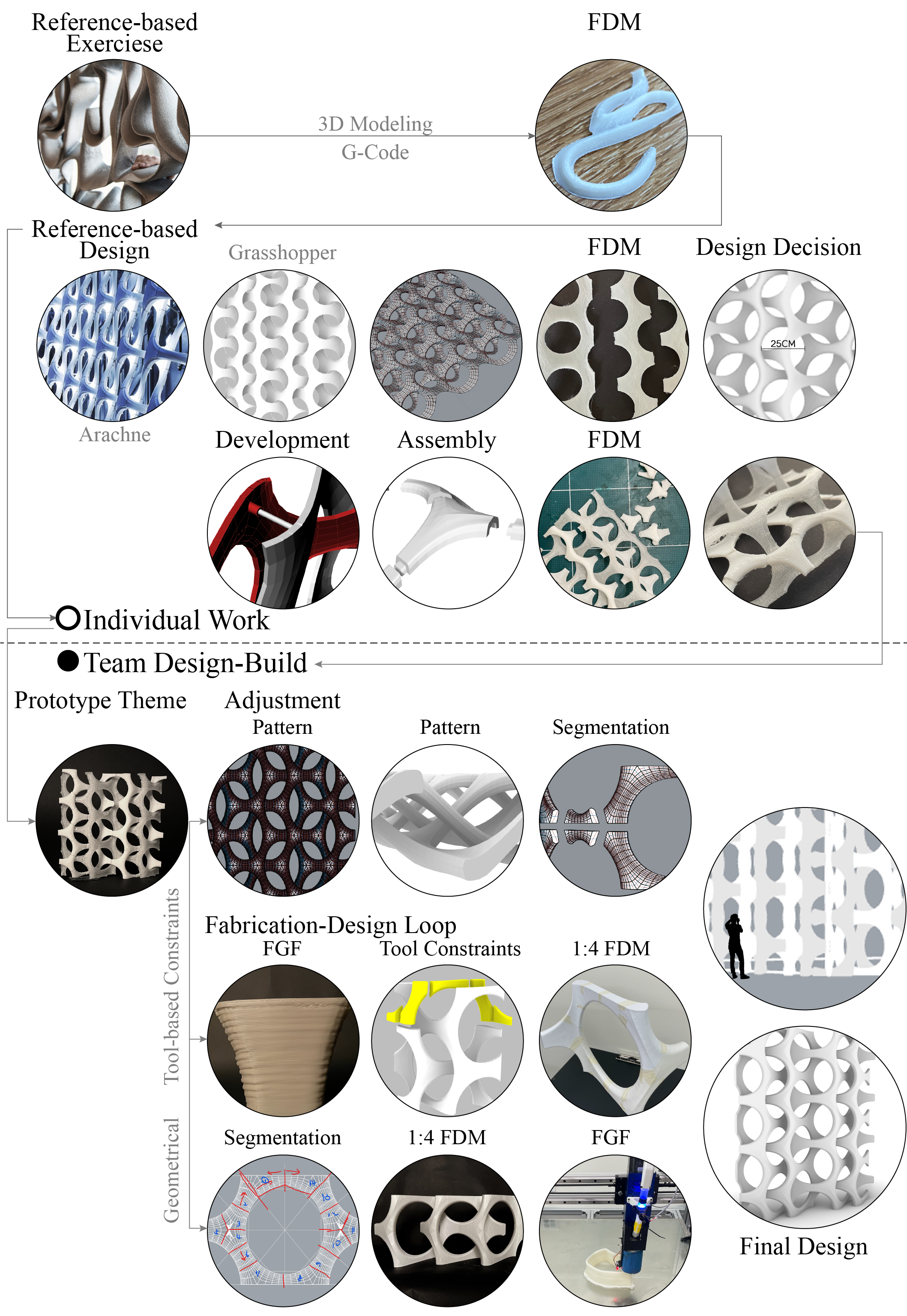 2021년 1학기 대학원 교과목 ‘건축재료연구’를 “Prototyping Plastic Syntax (PPS): Process, Design and Fabrication”이라는 주제로 개설하여, FGF를 통한 건축 외피 프로토타이핑 실험을 16주 동안 진행하였고, 교과과정과 방법에 대해서는 3장에 기술하였다. 이 교과목은 플라스틱을 중심으로 디지털 패브리케이션을 활용한 구축 방법을 체득하고, 건축 적용에 대한 아이디어를 발전시키는 것을 목표로 하였다. FDM과 FGF 실험을 통해 플라스틱의 압출성형을 이해하고, 3D 프린팅으로 가능한 비정형 건축 외피 모듈을 디자인하고 FGF로 1:1 프로토타입을 제작하기 위해 디자인을 조정, 수정하는 과정을 거쳐, 최종 모델을 제작하여 전문가 평가를 진행하였다.