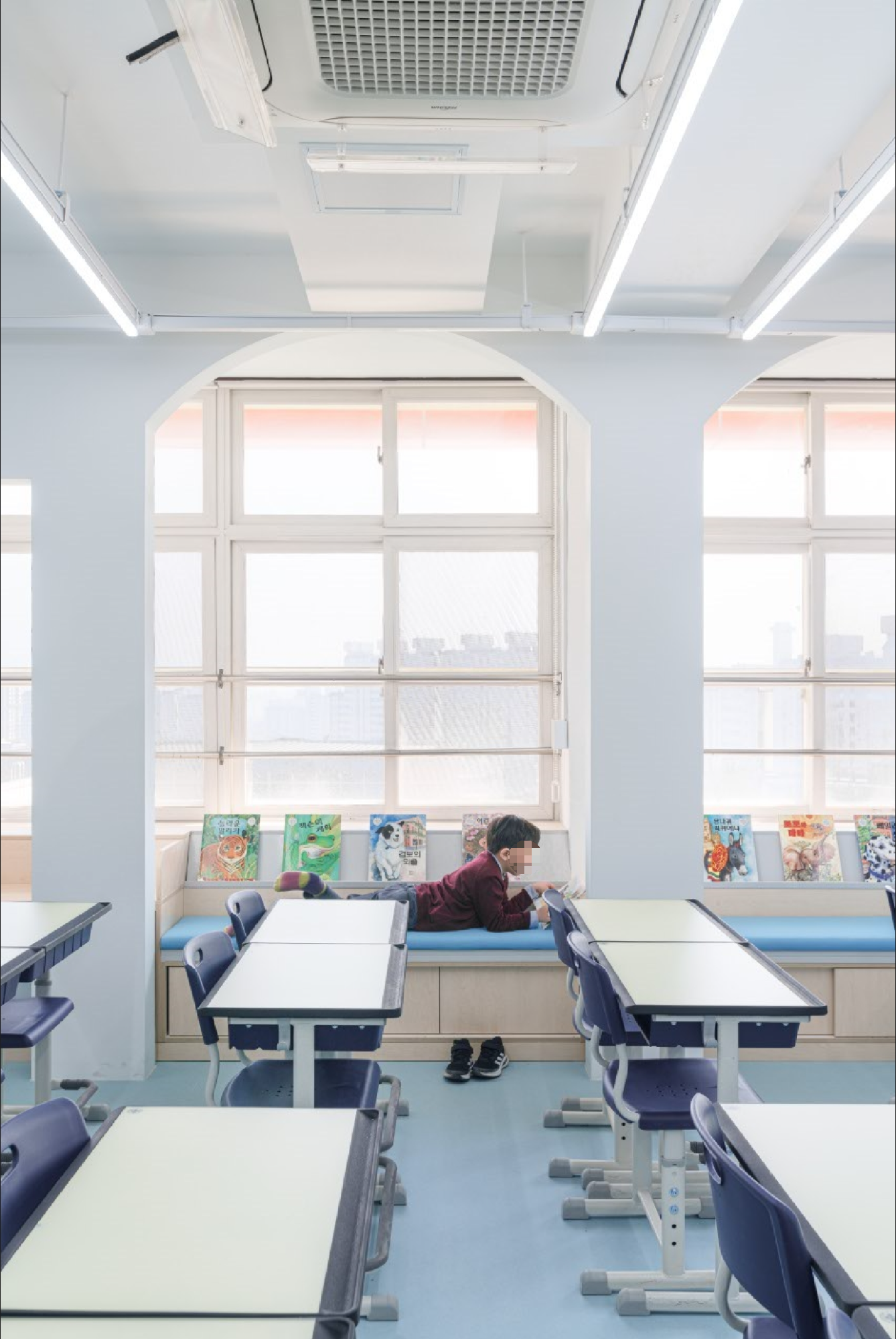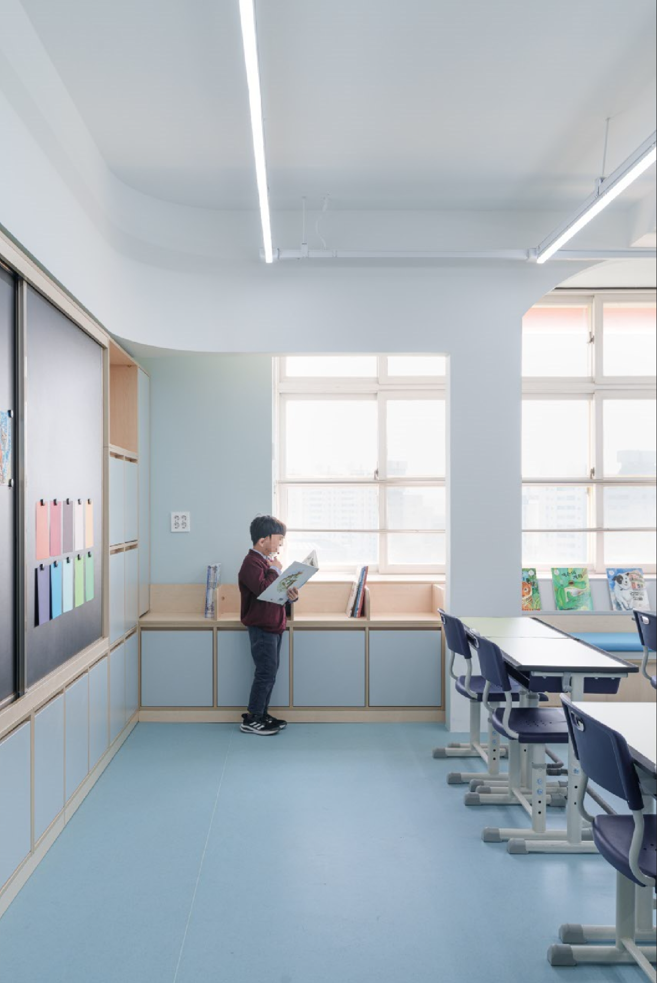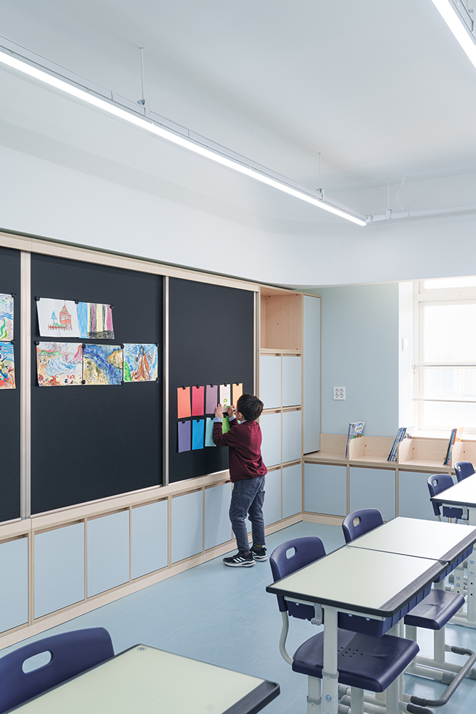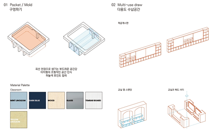 교실의 경우 기존 천장을 철거하여 높은 공간감을 줄 수 있도록 하되, 기존의 정방형 공간을 벗어난 입체적 공간을 경험할 수 있도록 천장과 벽면에 곡면 및 양음각을 부여하였고, 이러한 입체적 벽감 공간을 활용하여 벤치공간, 독서대공간, 수납 공간 등의 여러 기능을 부여하였다.