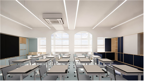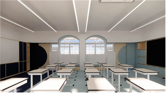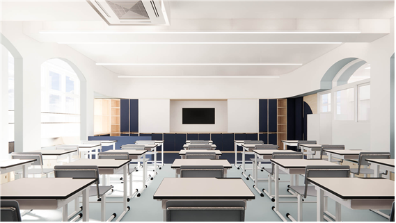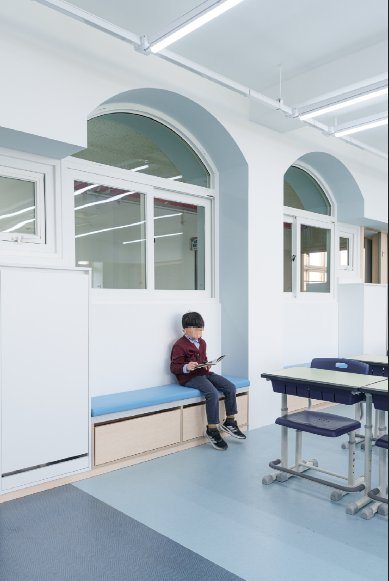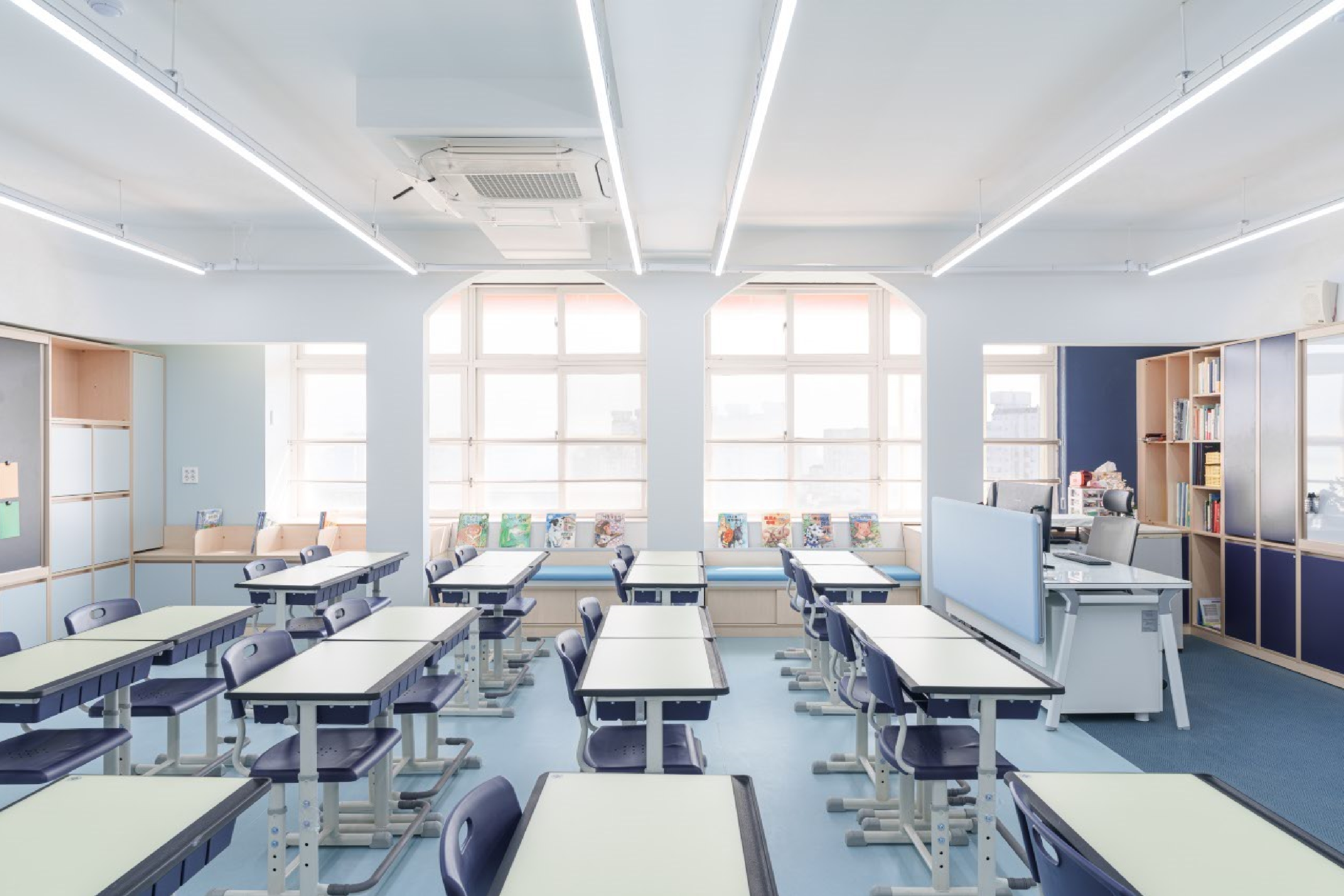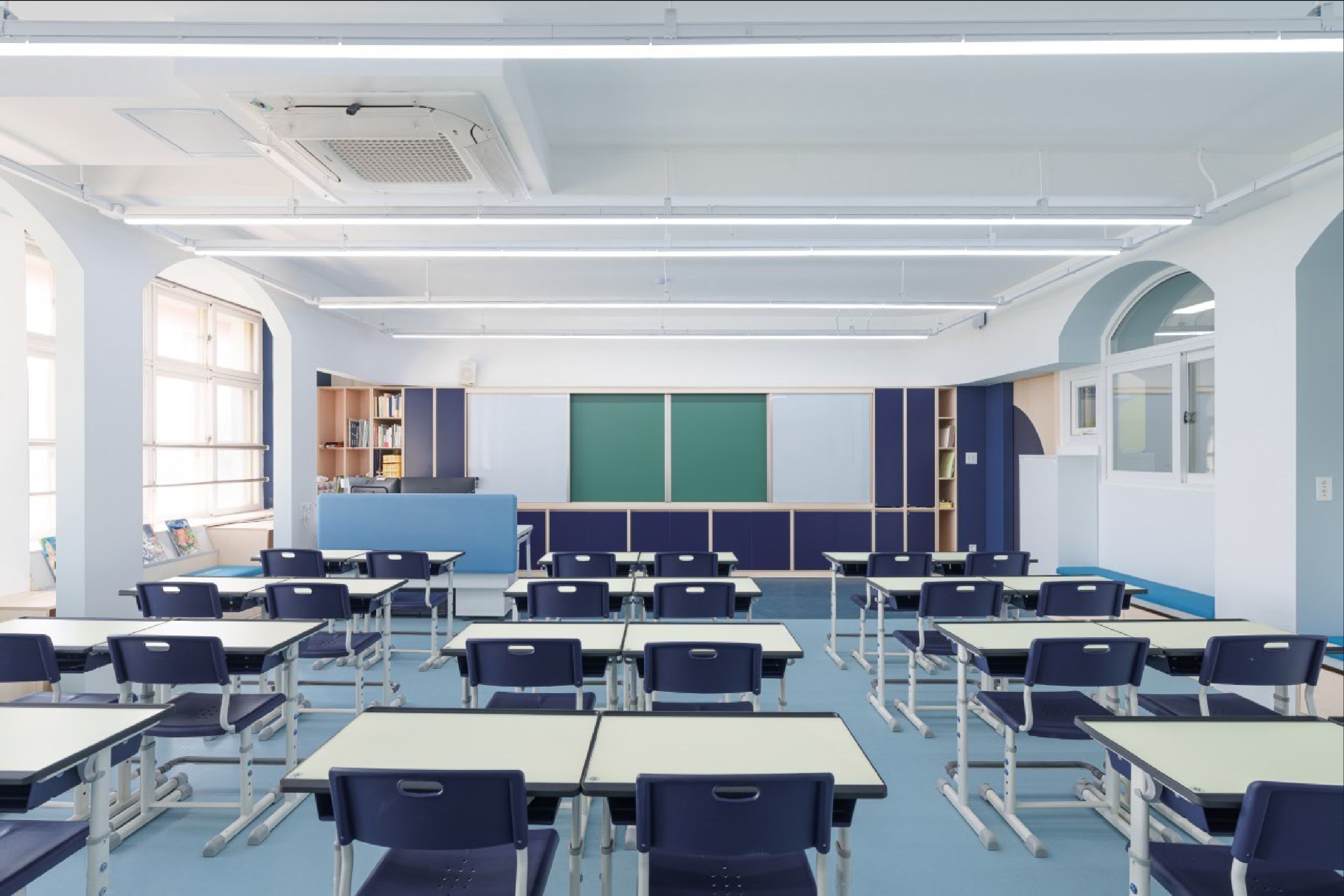 교실의 경우 기존 천장을 철거하여 높은 공간감을 줄 수 있도록 하되, 기존의 정방형 공간을 벗어난 입체적 공간을 경험할 수 있도록 천장과 벽면에 곡면 및 양음각을 부여하였고, 이러한 입체적 벽감 공간을 활용하여 벤치공간, 독서대공간, 수납 공간 등의 여러 기능을 부여하였다.