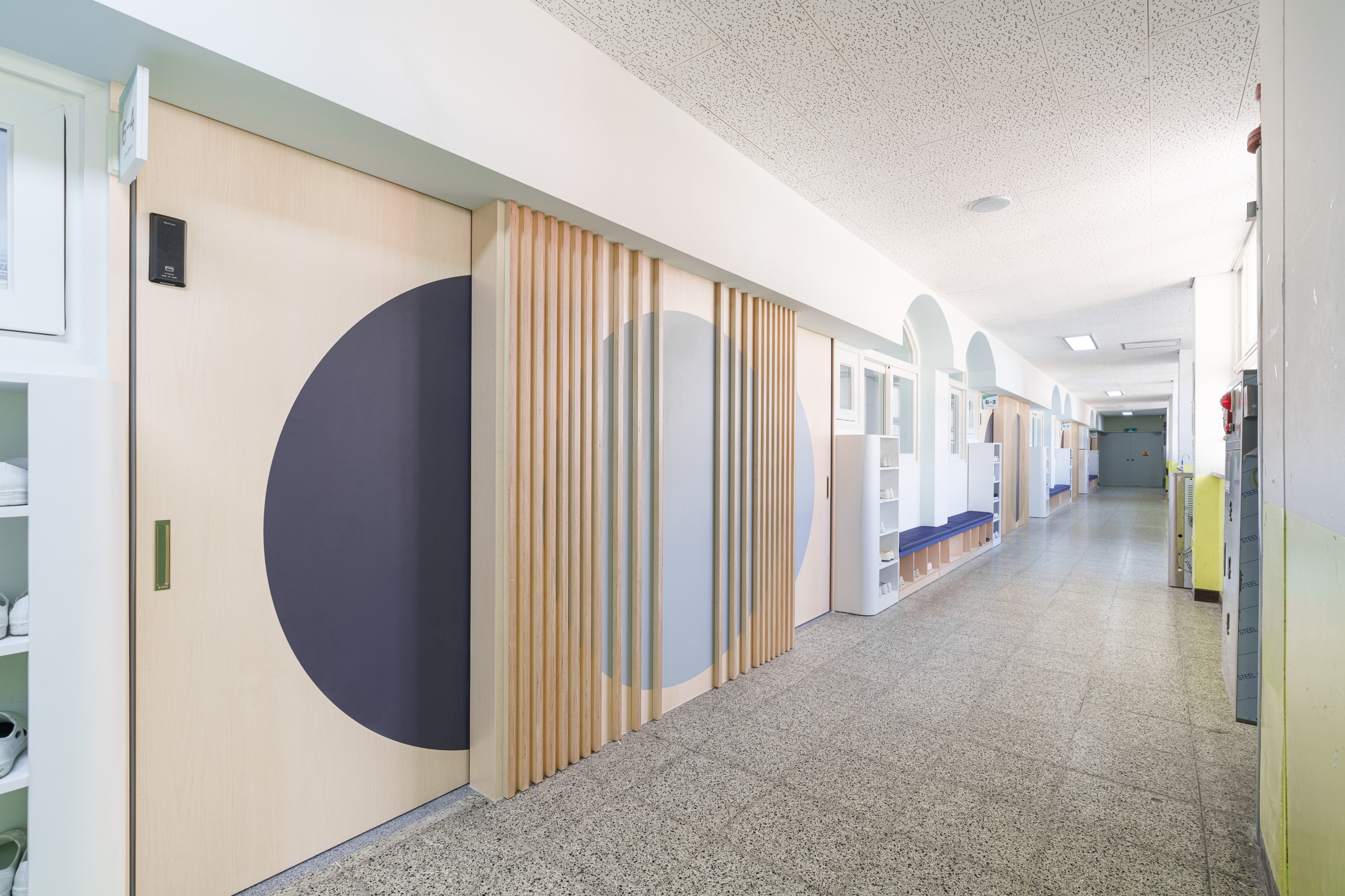 복도 공간은 아치형 창을 입체적으로 활용하여 포켓 공간을 조성하였으며, 신발장 겸 벤치를 통해 학생들이 대화를 나눌 수 있는 공간을 제공하고자 하였다. 밋밋한 복도 공간이 아니라, 다채로운 색상, 재질, 형태, 입체, 밀도 등을 통해 생동감 있는 공간을 체험할 수 있도록 의도하였다.