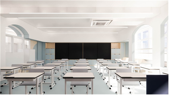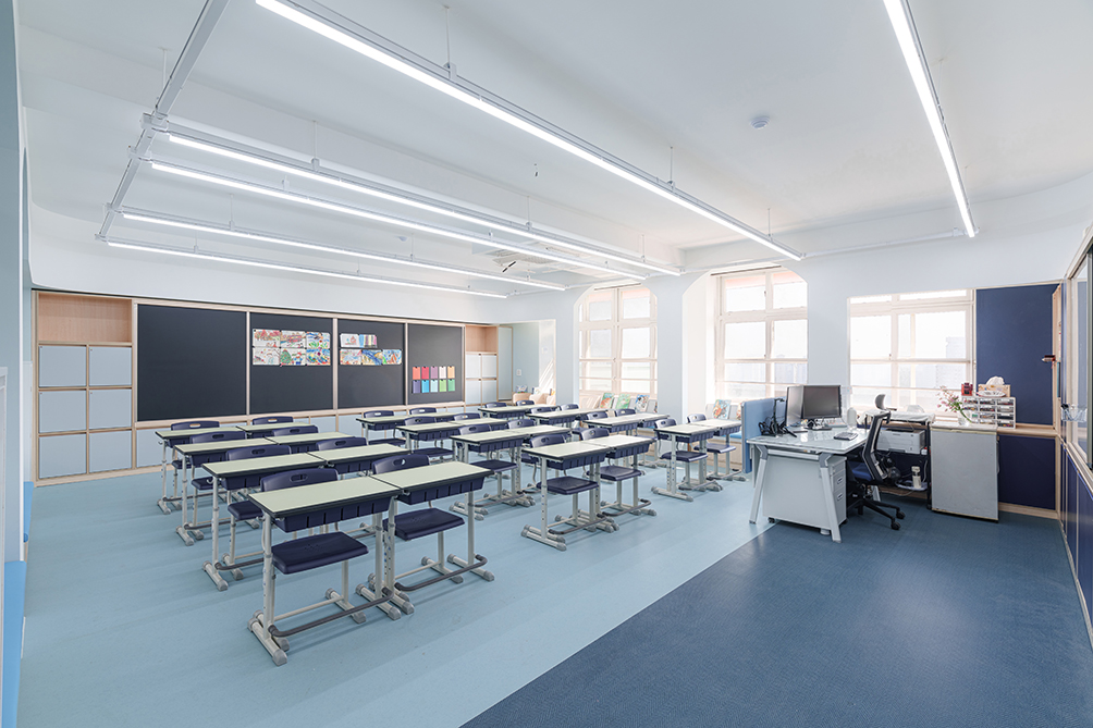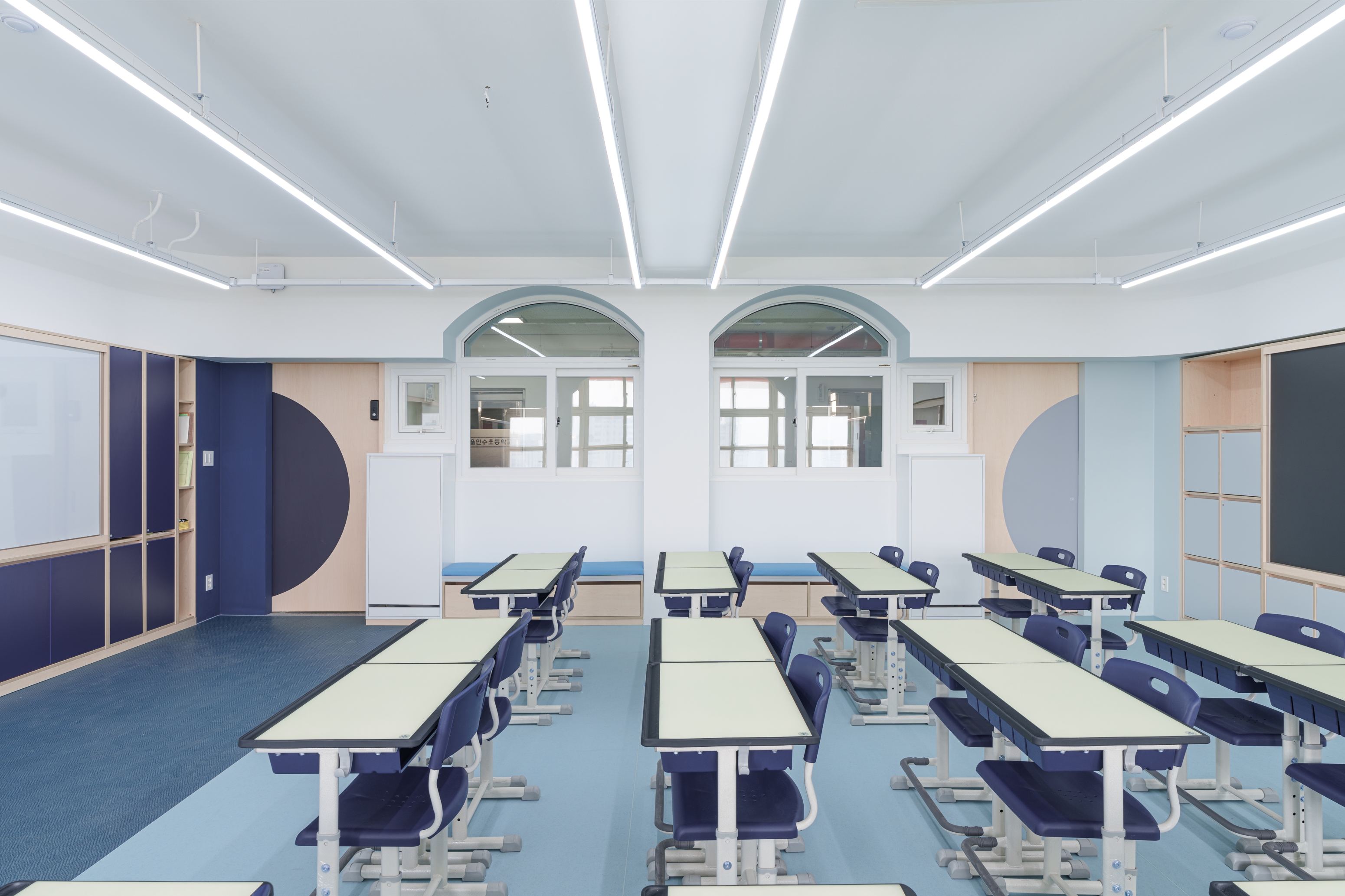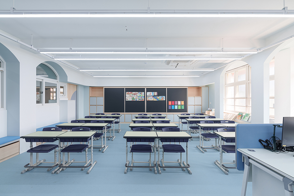 교실의 경우 기존 천장을 철거하여 높은 공간감을 줄 수 있도록 하되, 기존의 정방형 공간을 벗어난 입체적 공간을 경험할 수 있도록 천장과 벽면에 곡면 및 양음각을 부여하였고, 이러한 입체적 벽감 공간을 활용하여 벤치공간, 독서대공간, 수납 공간 등의 여러 기능을 부여하였다.