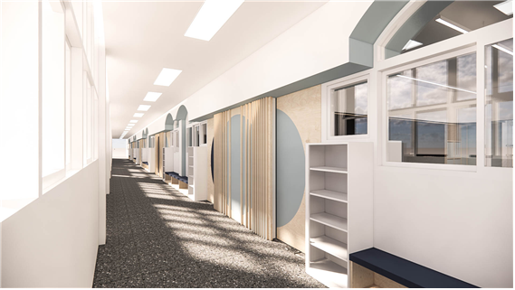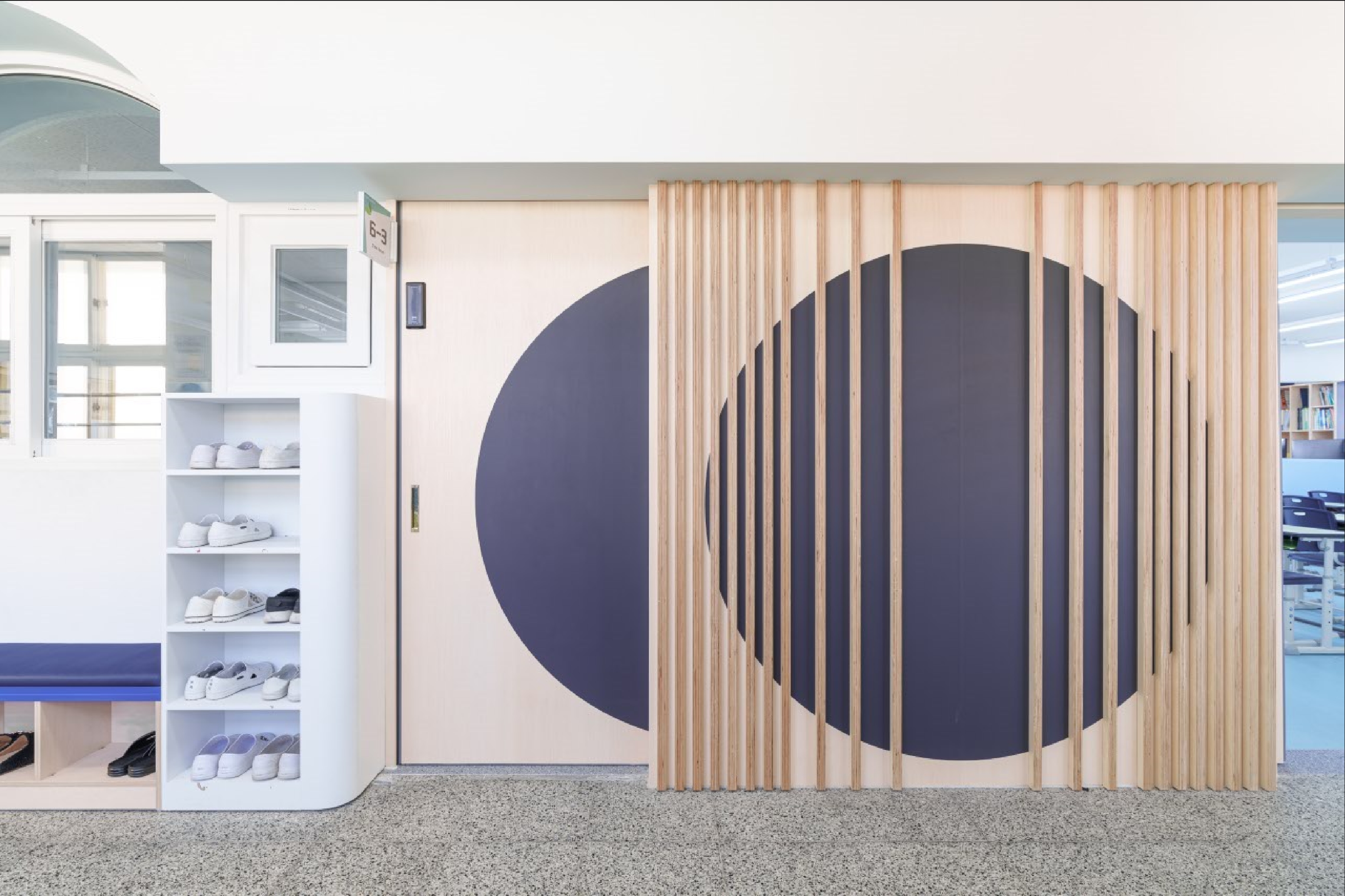 복도 공간은 아치형 창을 입체적으로 활용하여 포켓 공간을 조성하였으며, 신발장 겸 벤치를 통해 학생들이 대화를 나눌 수 있는 공간을 제공하고자 하였다. 밋밋한 복도 공간이 아니라, 다채로운 색상, 재질, 형태, 입체, 밀도 등을 통해 생동감 있는 공간을 체험할 수 있도록 의도하였다.