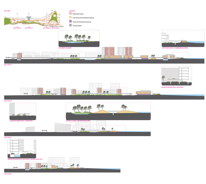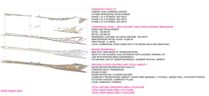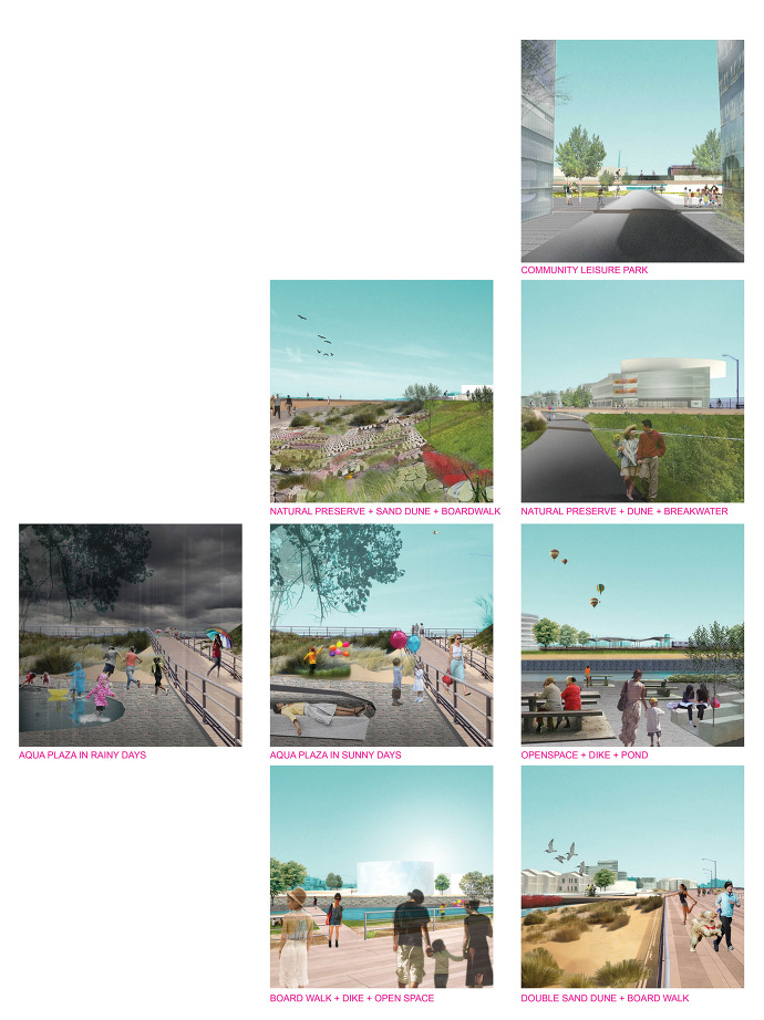 본 작품은 미국 뉴욕시에서 주최한 FARROC FOR A RESILIENT ROCKAWAY COMPETITION에 제출된 제안이다. 지속적으로 해일과 홍수의 위험에 노출된 지역을 개발하는 방식으로서 지면보다 들어올려진 네트구조의 연결망을 통해 도시 조직을 구성하고, 해면-지면-네트면 등의 서로 다른 층위에서 다른 활동과 프로그램들이 벌어지고 엮일 수 있도록 제안하였다. 그리고 이렇게 다른 층위들은 기후의 변화에 따라 다르게 반응하여, 변화를 받아들이고 새로운 풍경과 활동들을 발생시킬 수 있는 기제로 존재한다.